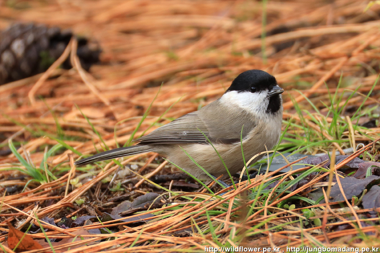 쇠박새 - 크롭 사진입니다. 바닥에서는 잘 안보이는데 이날은 솔잎 사이 사이 먹이를 찾는 모습을 봤습니다.