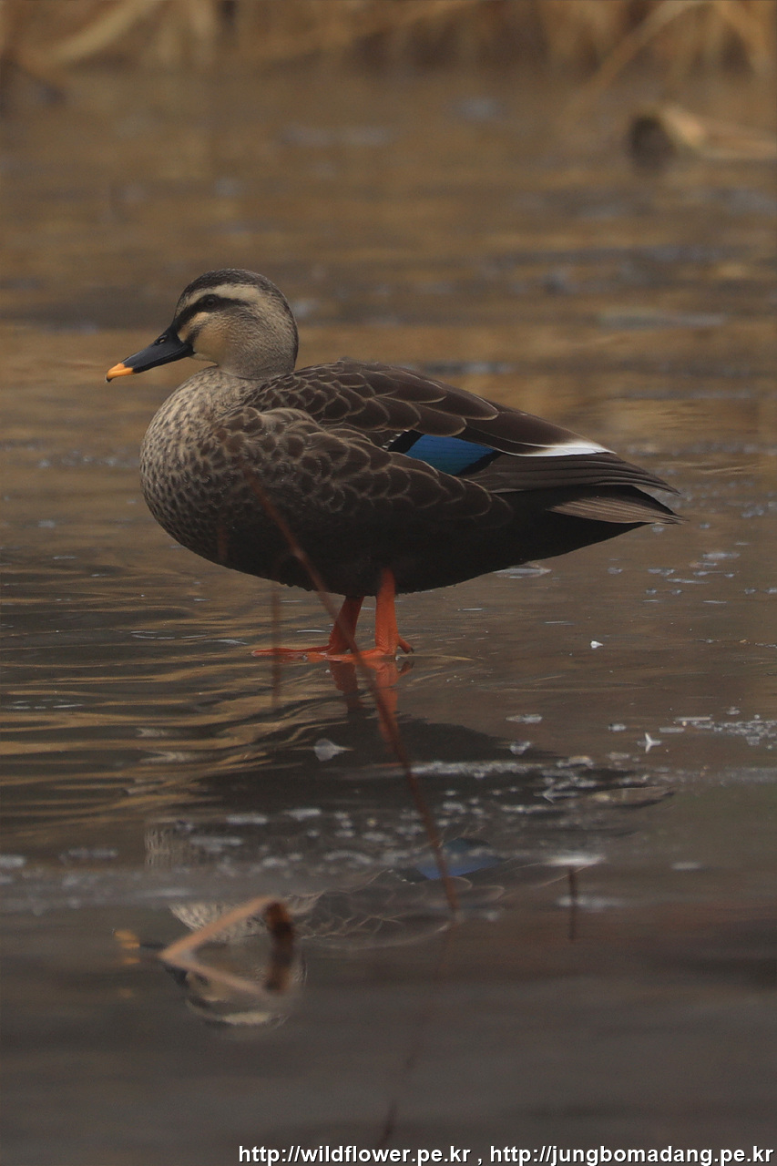 흰뺨검둥오리 - 크롭 사진입니다. 대부분 얼음이 있지만, 얼음이 녹은 곳에는 오리들이 왔다 갔다 하네요.