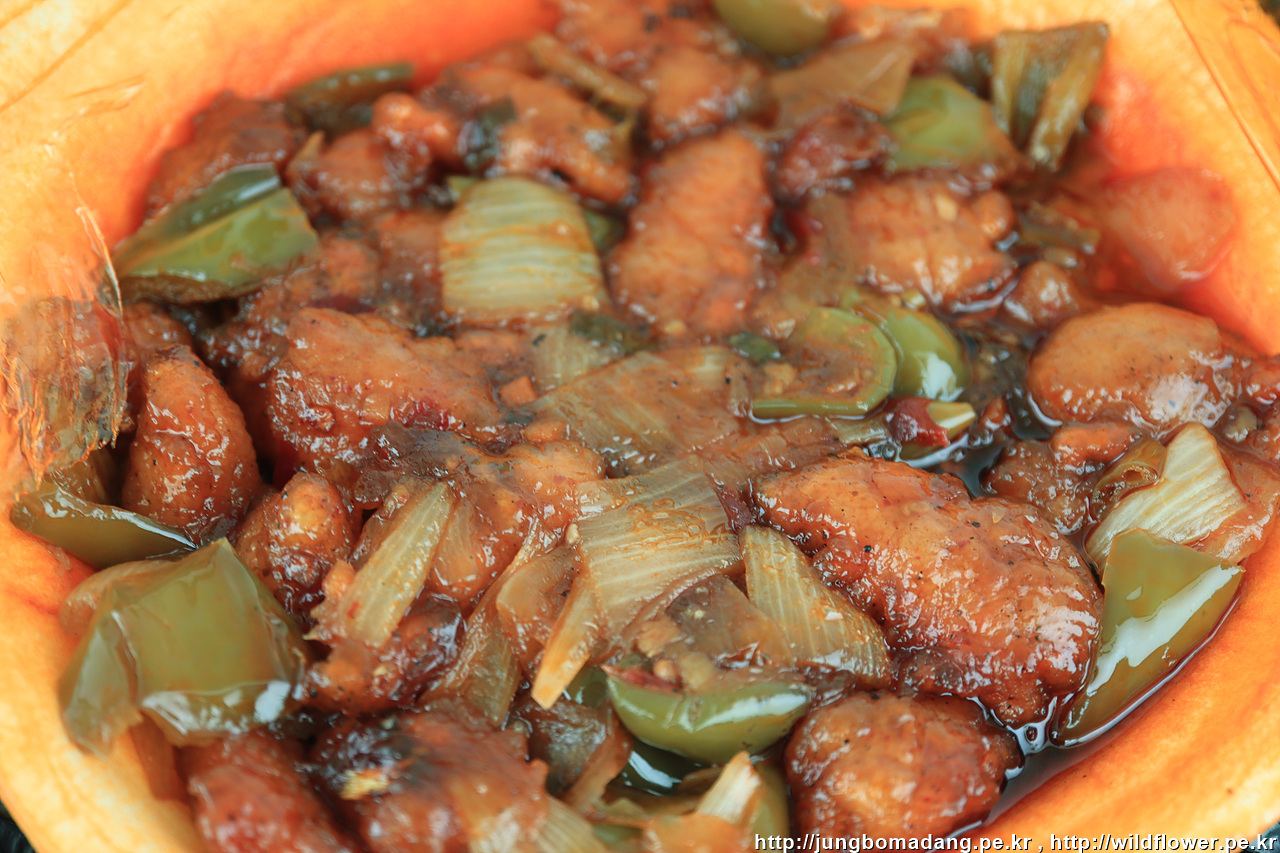 그렇게 은밀하게 위대하게 자리를 잡고 시작을 합니다. 깐풍기가 얼마나 뜨겁던지 포장용기가 일부 녹아서 살짝 놀랐네요.잘 걷어내고 먹습니다.