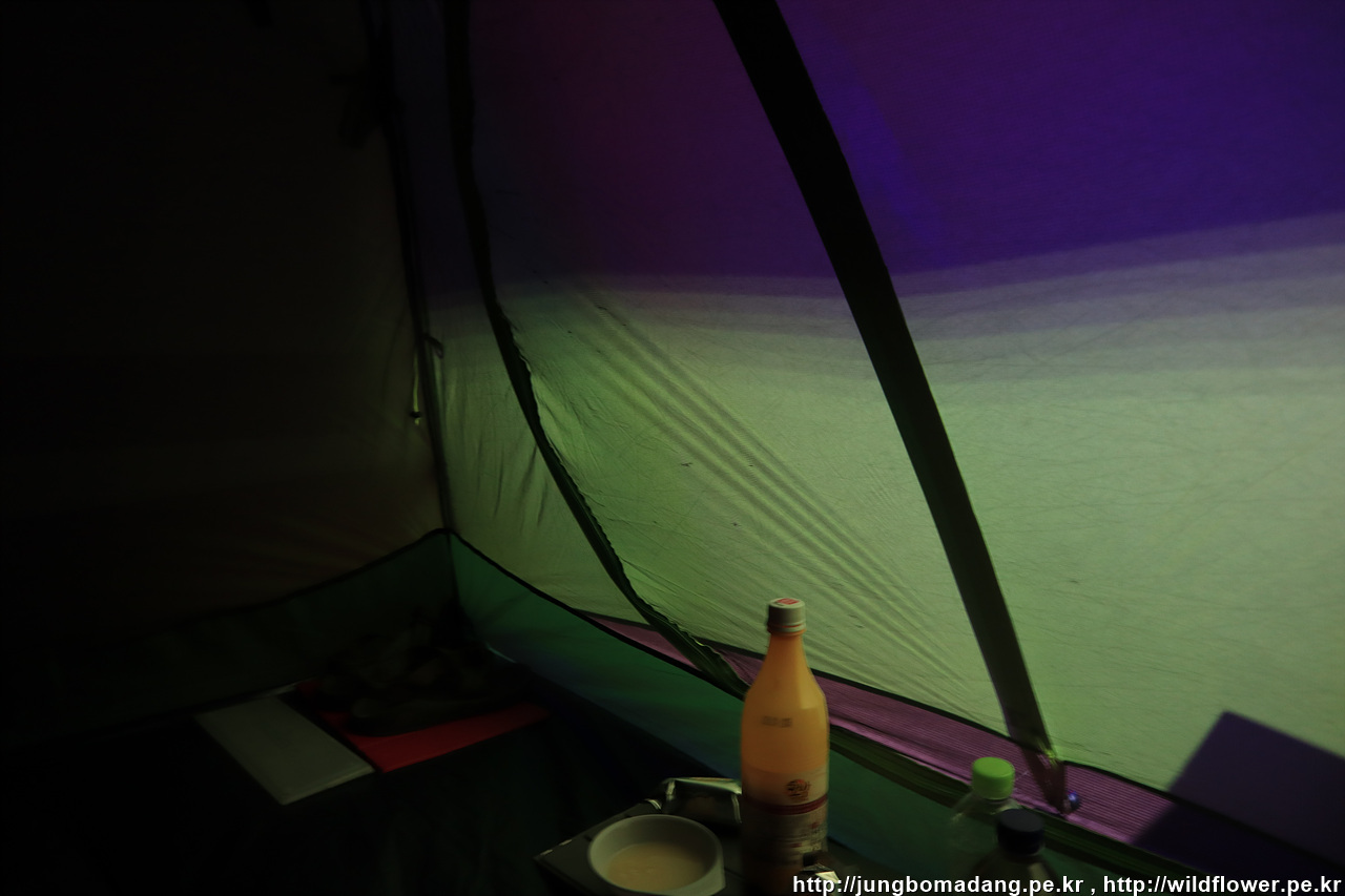 게다가 텐트가 휘청 휘청하는 칼바람도 불어오는 데..사태의 심각성을 인지하고 항상 휴대하고 다니는 여분의 끈으로 완벽하게 텐트의 펄럭임을 잡아 냅니다. 끄떡 없네요!!