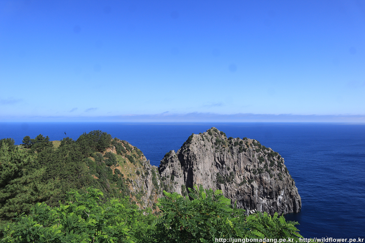 비경도 바라봅니다. 저 끝에 송곳봉도 보입니다. 바다 쪽에는 코끼리바위도. 절벽 부근에 하얀 점들은 괭이갈매기 입니다.
