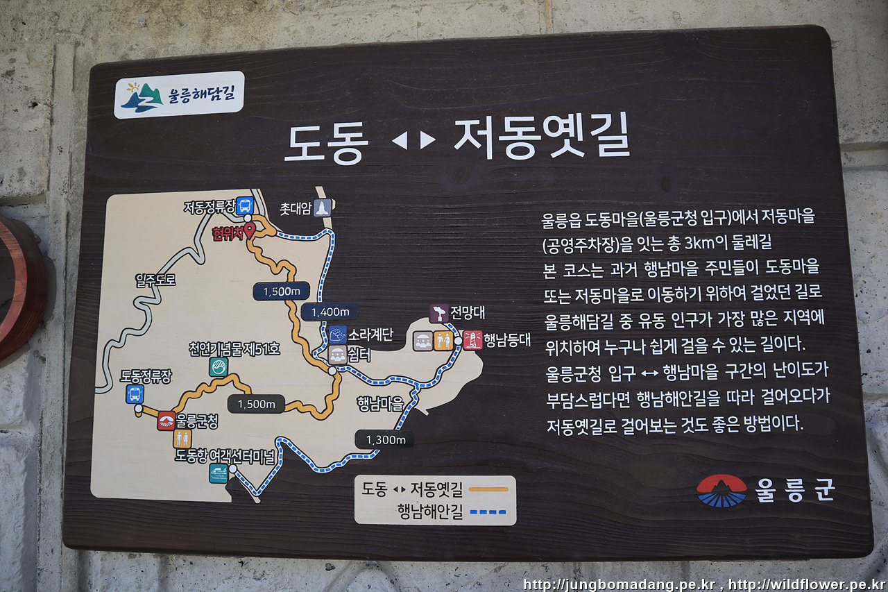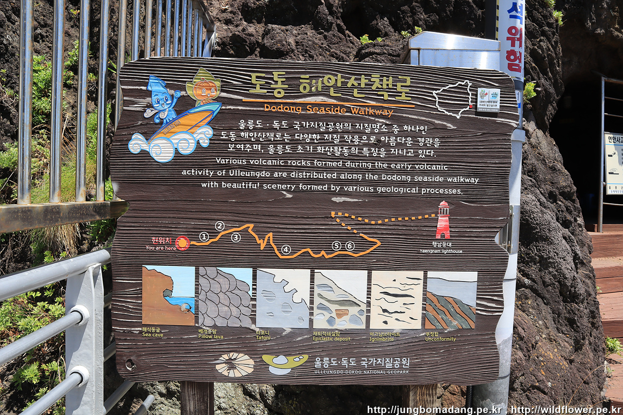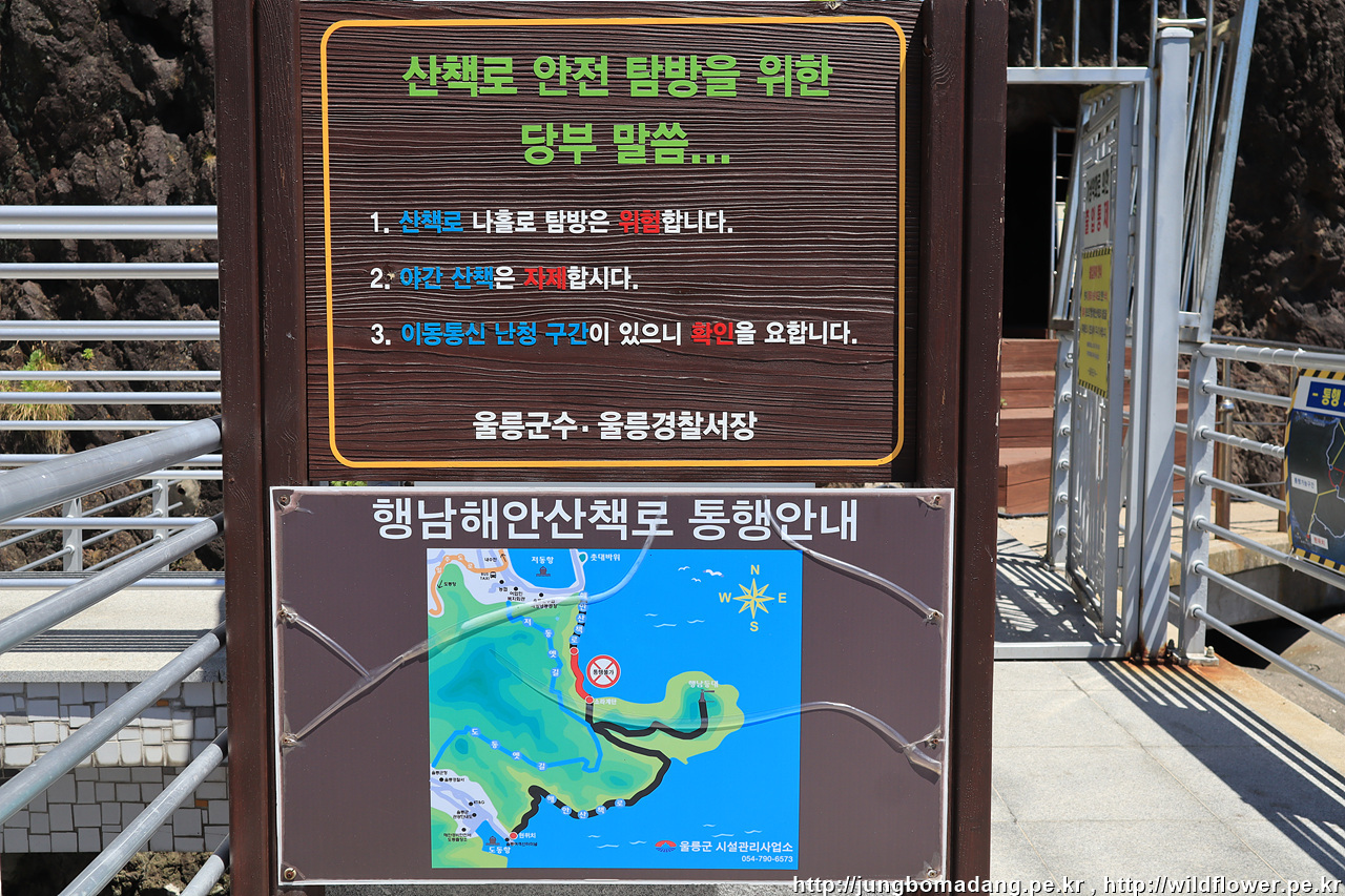 도동에 도착했으니 행남 해안 산책로를 타고 저동으로 넘어가기로 합니다. 얼핏 통제 이야기가 있어서 차타고 오면서 물으니 통제 안한다고 하시네요. 실제 걸어보니 도동에서 행남등대까지는 정상. 행남등대에서 촛대바위(저동)까지는 일부 구간 통제로 통행이 안되네요. 나중에 배타고 나가면서 확인하니 산책로 일부가 무너져서 유실이 되어 있더라구요.
