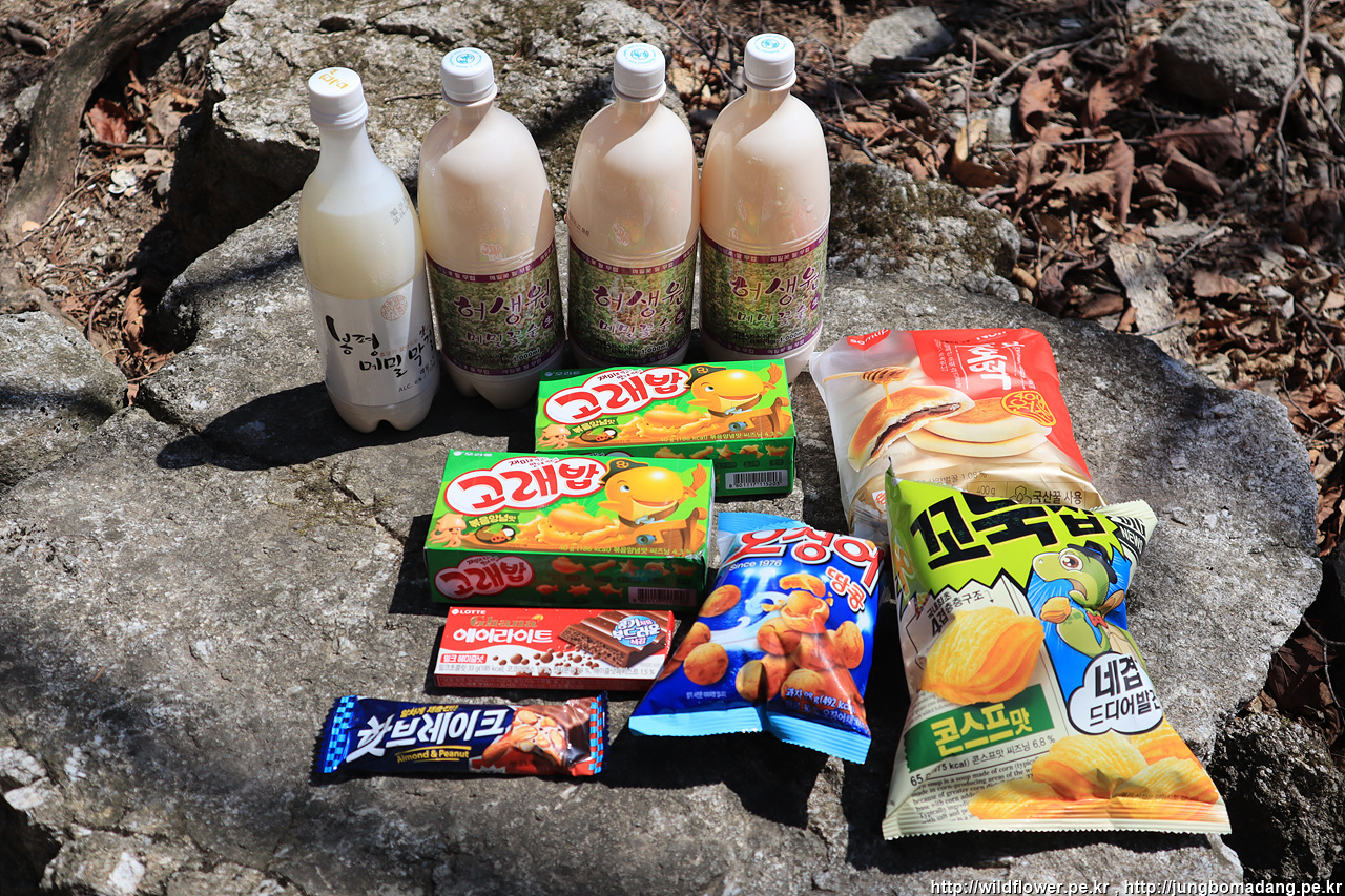 쉬어가기 좋은 반듯한 바윗돌 위에 자리 잡습니다. 하나로마트에서 턴 물건들... 고래밥은 집에서.