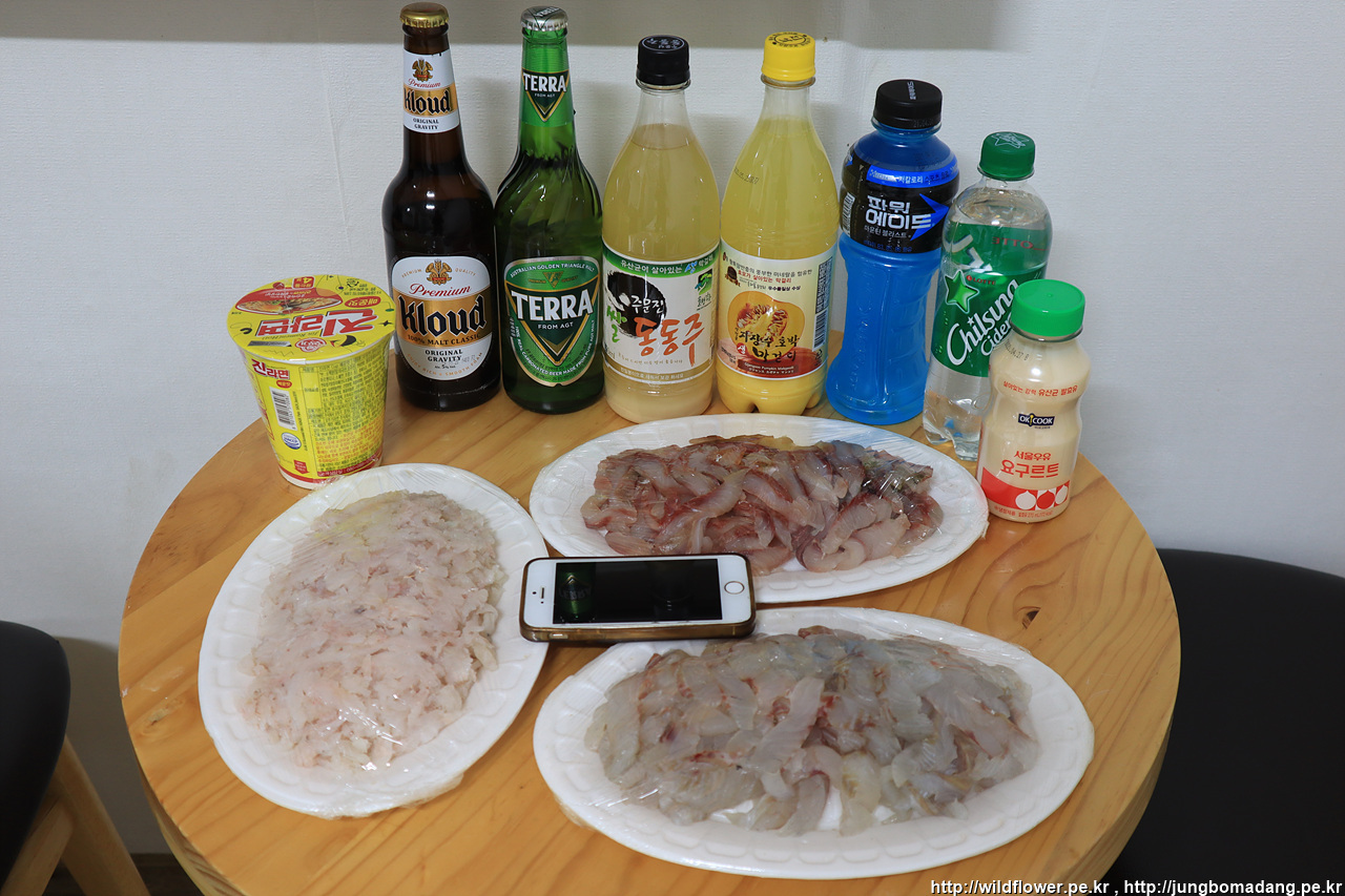그렇게 지금 쇼핑한 거 좌좐~ 회 사이즈는 아이폰SE와 비교. 중앙시장은 다른 많은 먹거리를 모두 뿌리치고 오로지 이 회만 보고 왔습니다 ㅠ