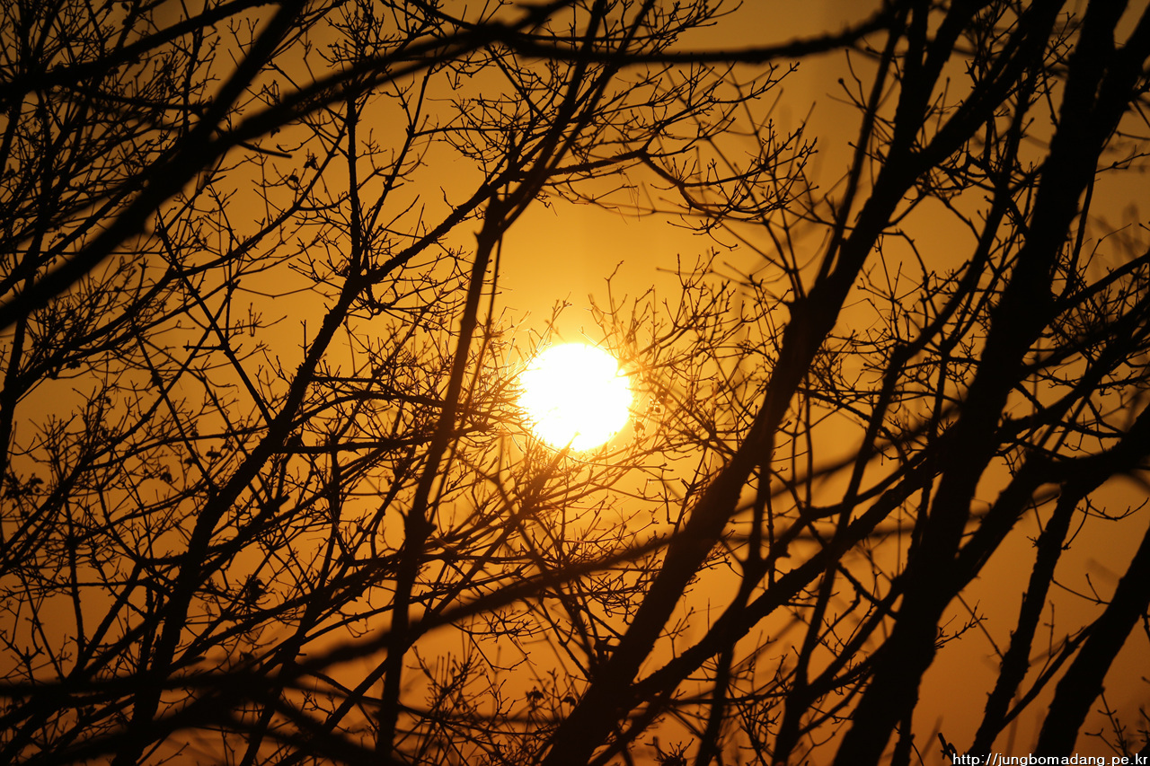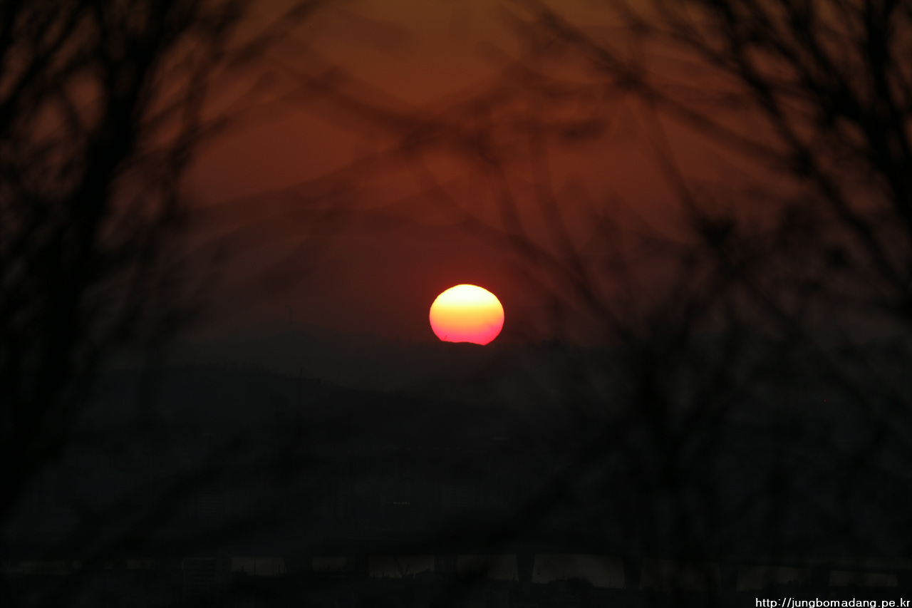 가리워진 나뭇가지 틈 사이로 바라본 일몰을 보면서 남산에서 봤다면 좀 더 깨끗 했을텐 데 하는 아쉬움이. 하지만, 안산 자락길을 와본 건 잘한 일