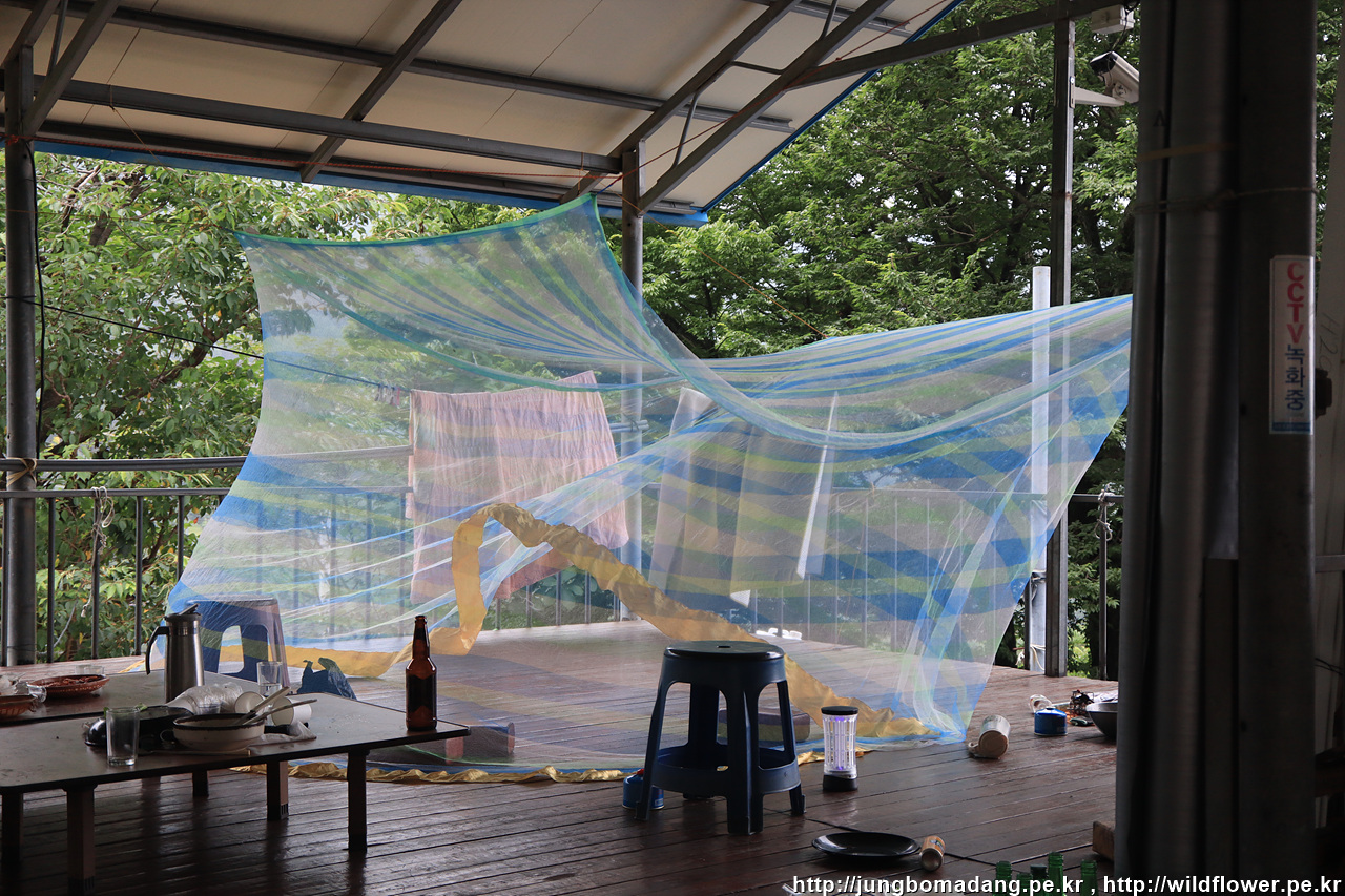 모기장도 쳐 놓고. 근데 자리를 잘못 잡아 더운 곳이라 짐 보관용으로만 이용하게 되었네요.