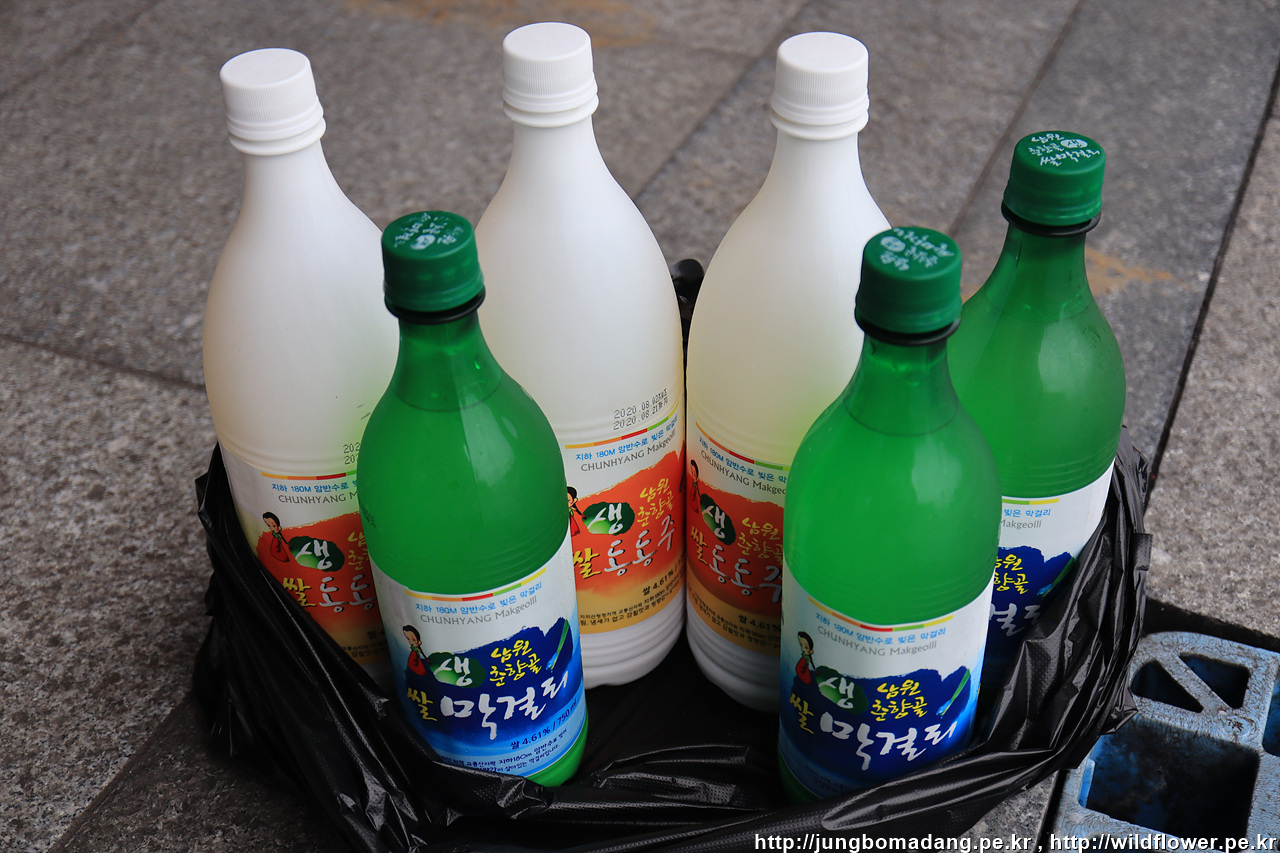 전 간단히 6병. 동동주는 1200ml 2000원, 생막걸리는 750ml 1000원. 가진 현금이 9천원이라 9천원어치만 주문합니다. 카드도 받는다는 데, 막걸리를 카드 내고 구매하고 싶지는 않아서요. 다른 분들도 각자 적당량을 구매하고
