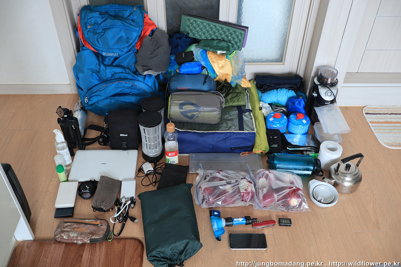 날씨가 수상해서 타프도 챙기고, 산모기에게 헌혈하지 않기위해 모기장도 챙기고, 모기나 날파리 잡는 제품도 챙기고, 커피 그라인더도 챙기고, 그 외에 전 부칠 도구등등 이거 저거 챙기다보니 짐이 꽤 많네요.