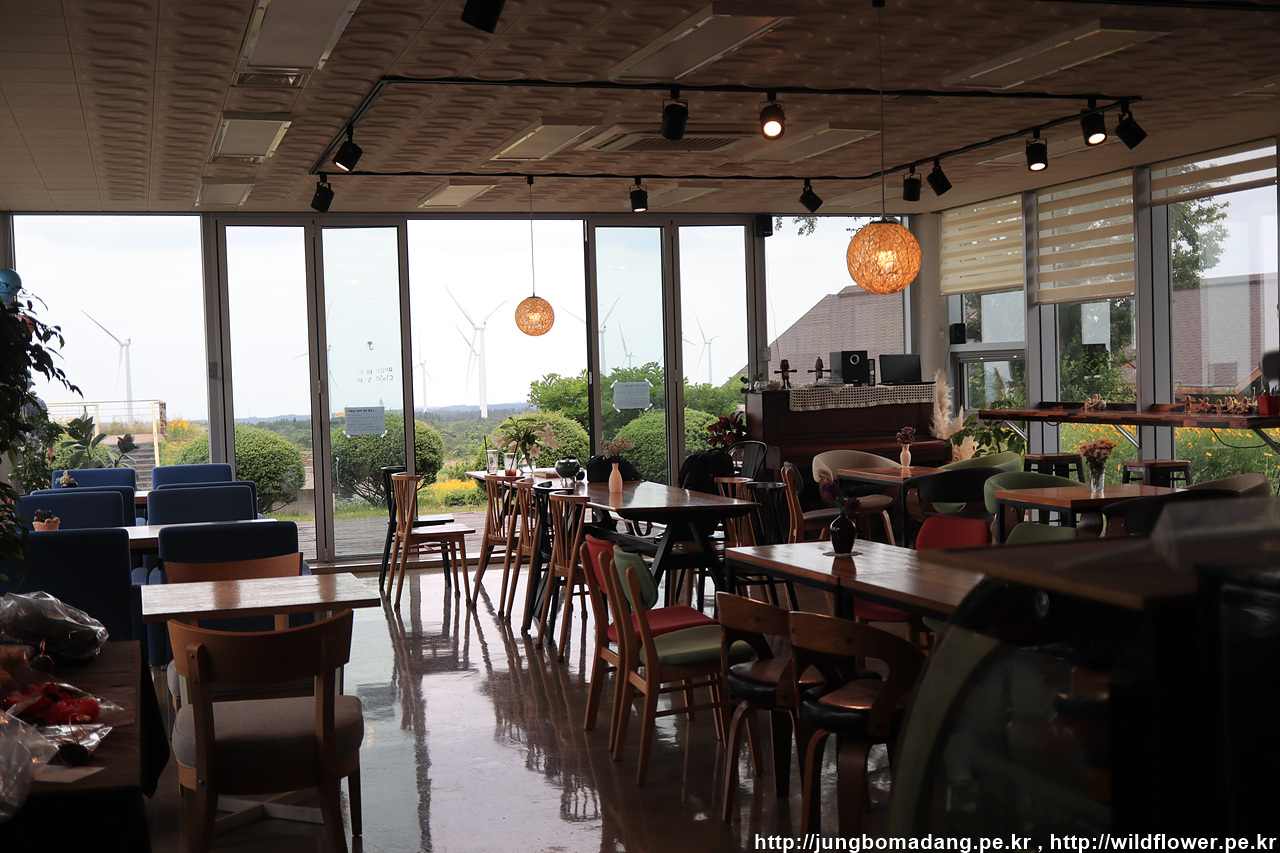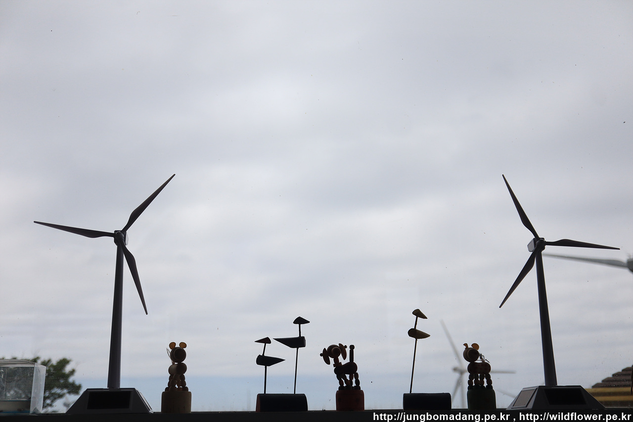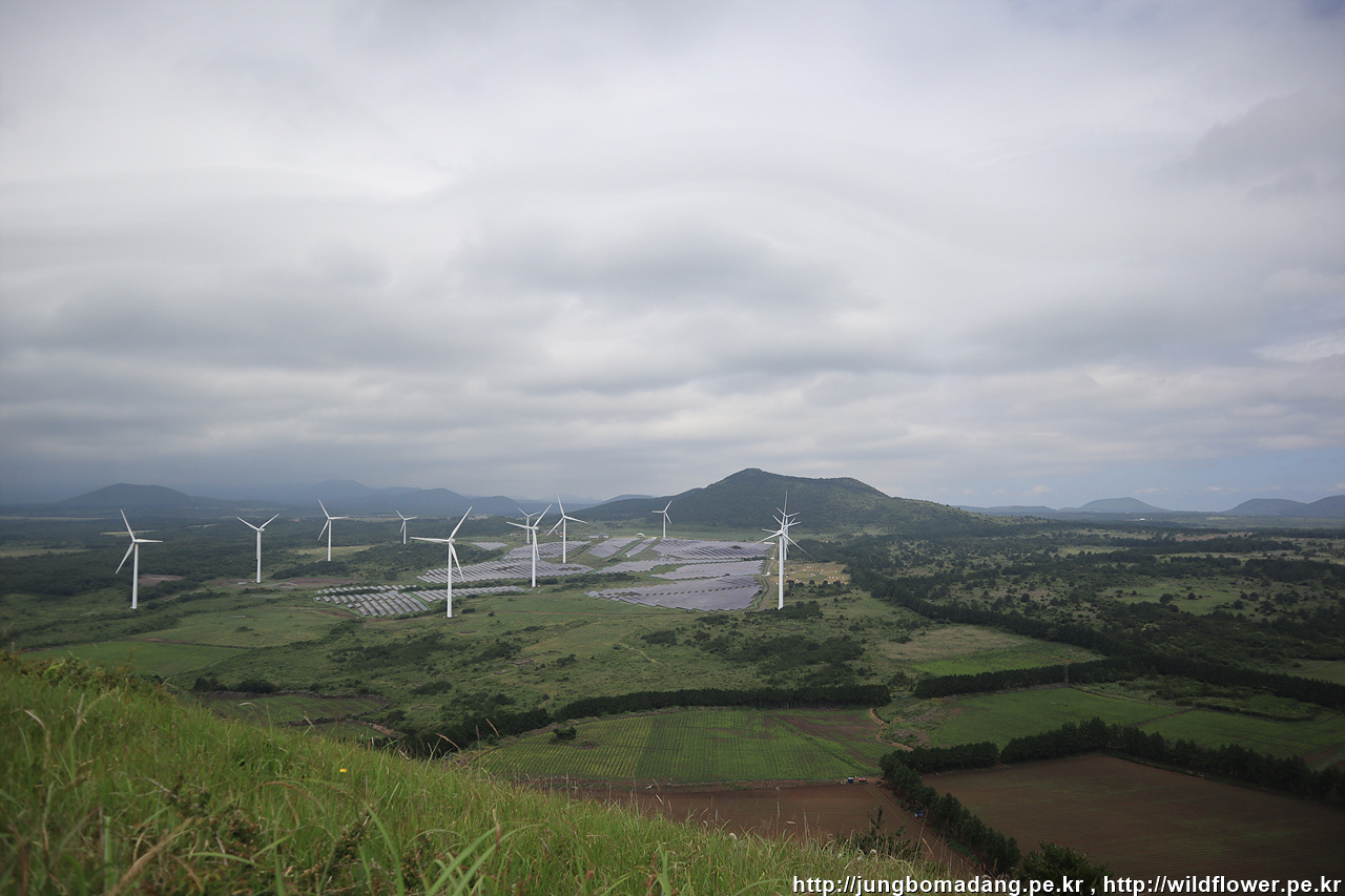 앞으로 가야할 방향을 봅니다. 풍력발전기 뒤로 대록산(큰사슴이오름)이 보입니다.