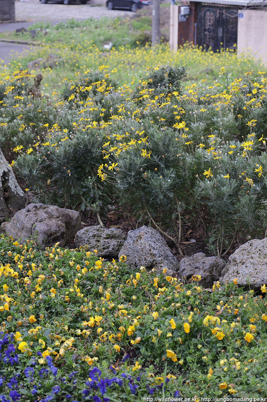 멀리 노란색은 유채, 유채 아래 노란건 유래옵스, 유리옵스 아래는 팬지