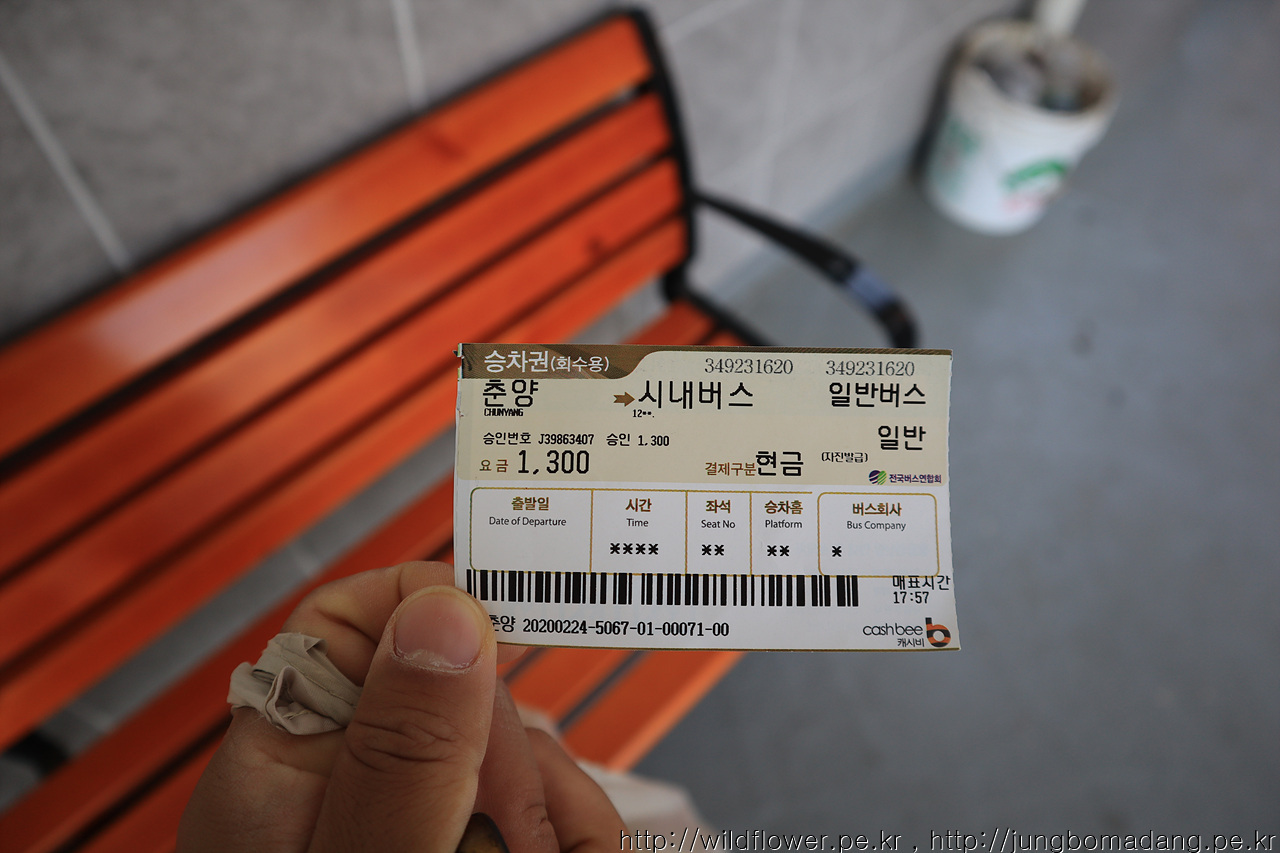 매표소에서 카드 안되고 현금으로 1300원에 이렇게 표를 줍니다. 그럼 꼭 쥐고 버스 타서 기사님 나타나면 앞에 돈통에 넣어 주시거나 기사님 드리면 됩니다.