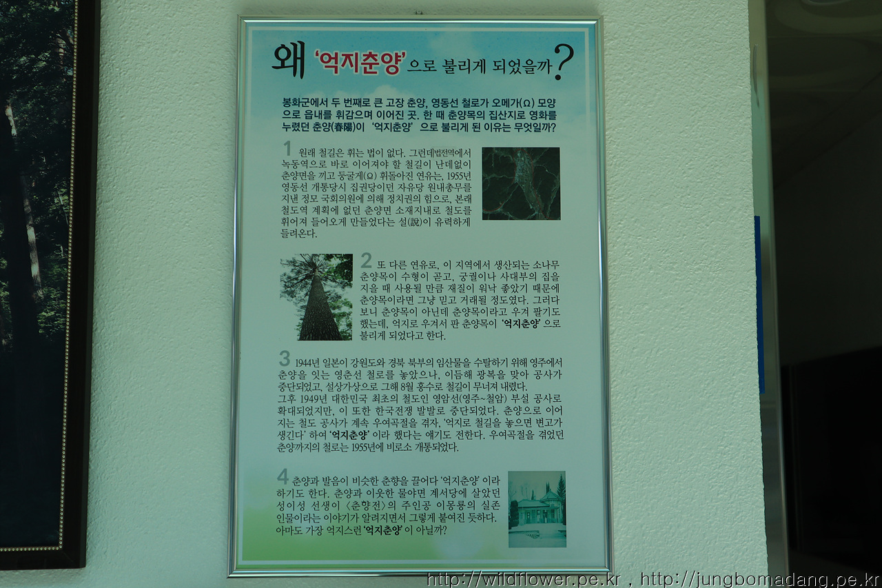 억지춘양이라는 말 아시나요? 그 유래가 몇가지 있는 데, 그 중 하나가, 춘양역을 건설할 때, 직선으로 해야하는 데, 이렇게 하면 춘양시내 외곽에 역이 설치되기 때문에 그 당시 춘양 출신 정치인의 입김으로 춘양 시내를 억지로 경유하게끔 철도 건설을 했다 해서 억지춘양이라는 말이 나오게 되었죠.