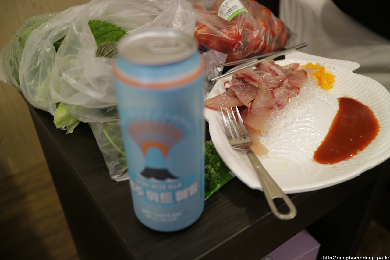 오후 2시가 넘은 시간, 또 어디를 가나 고민하다 한라수목원에 전화 했더니 꽃은 없고 나무만 많다 하셔서 패스하고, 숙소에 일찌감치 자리 잡고 저녁을 해결하러 나오려는 데, 엄니가 그냥 저녁은 숙소에서 먹자하시네요. 하나로마트에 들려 회(방어회) 두접시를 포함 먹거리를 5만원어치 구매하고 15시에 맞춰 숙소로 향합니다.