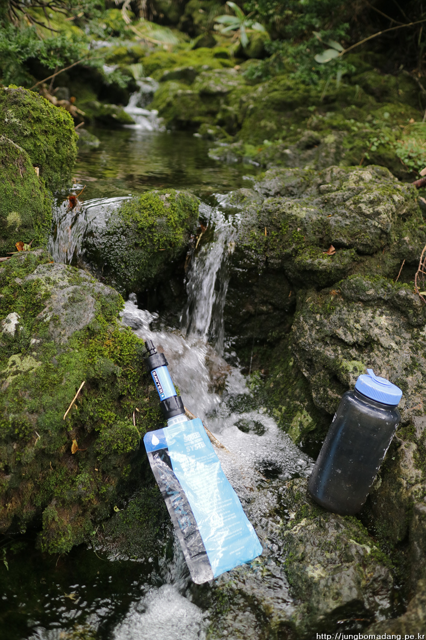 샘터가 안보여서 어느정도 오른 관계로 요래 계곡물을 정수해서 가득 담아 갑니다. 물맛 끝내주네요!