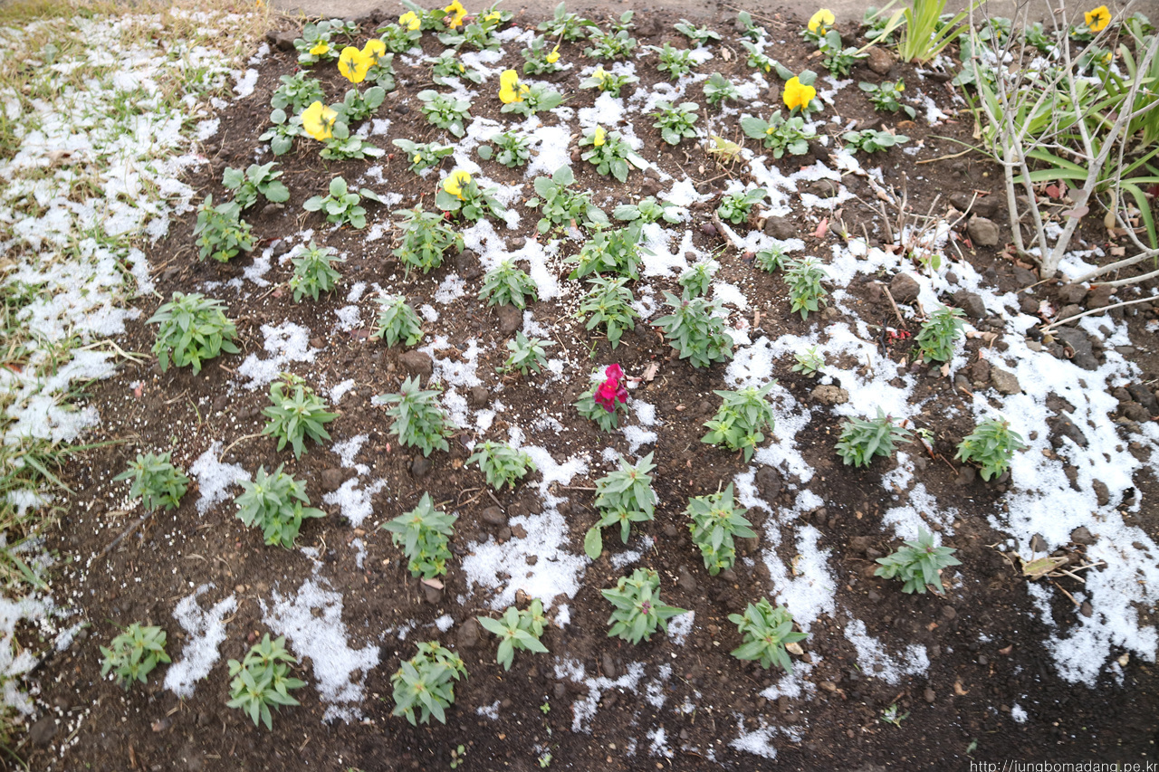눈이 내려서 그런지 꽃들이 춥게 느껴지네요. - 팬지