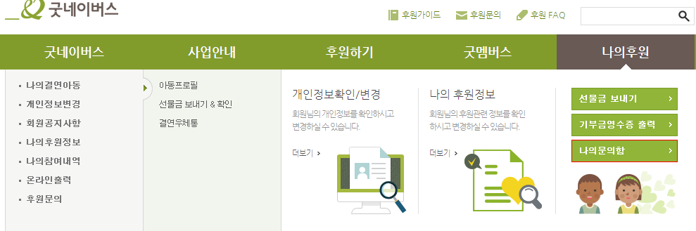 1. 홈페이지에 로그인 후, 상단 메뉴중에 우측에 [나의후원]에 마우스 커서 옮기면 아래 메뉴가 나오는 데, [나의문의함]을 클릭합니다.