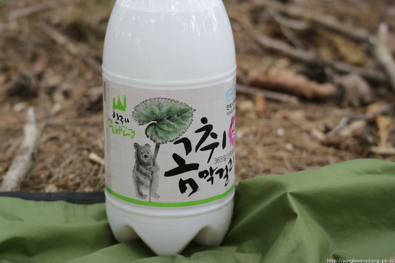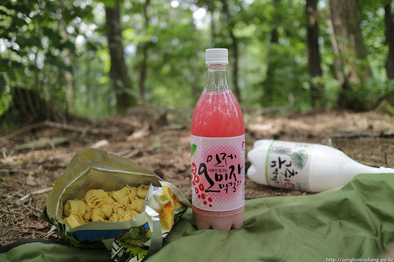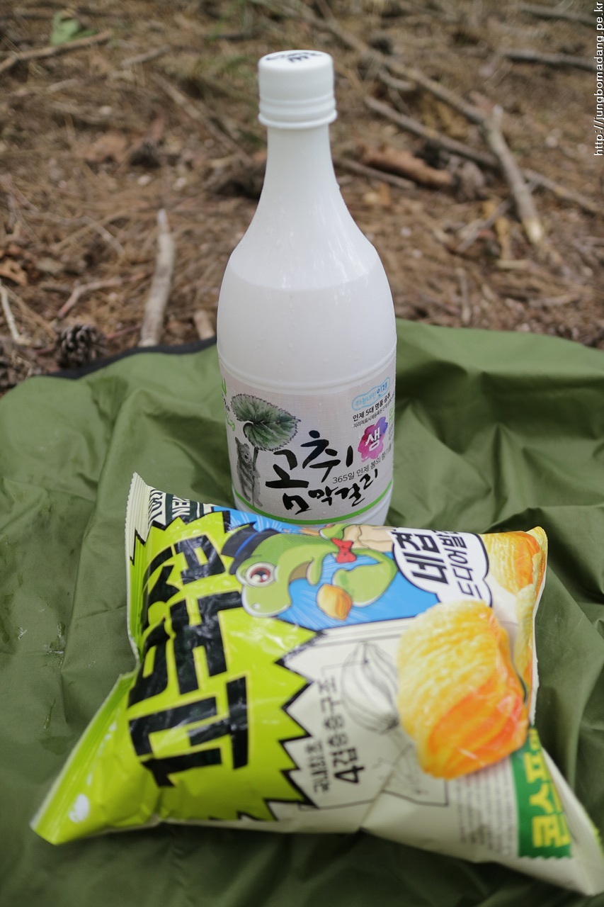 어느정도 정상에 가까워졌다고 판단해서 점심을 먹고 가기로 합니다. 곰취막걸리에 꼬북칩 냠냠