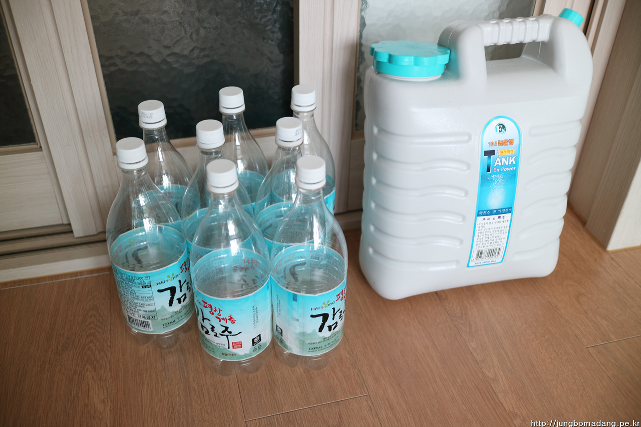 냉장보관을 위한 처절한 사투. 전에 비워둔 감로주 빈병이 고생하기로 합니다. 빈병은 1.2L짜리 입니다.