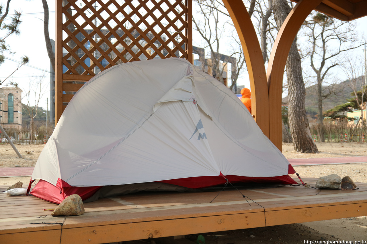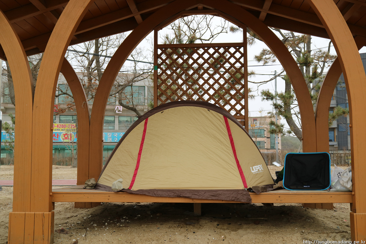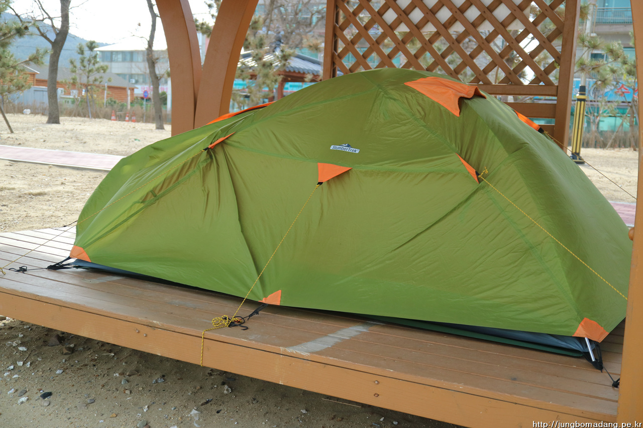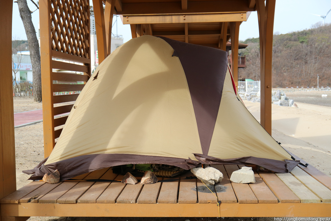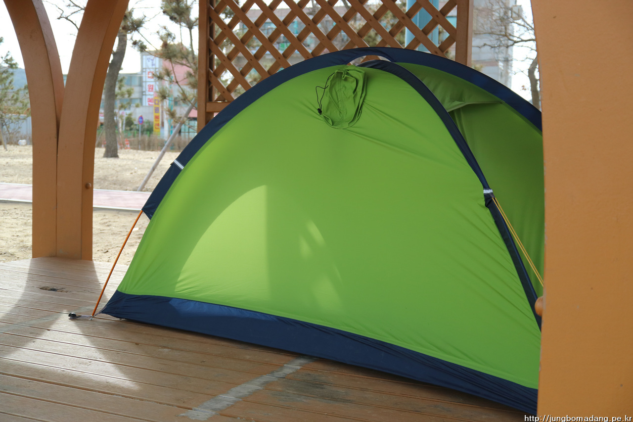 텐트가 임신했나요? 아닙니다. 바람이 불어서 이지경입니다.