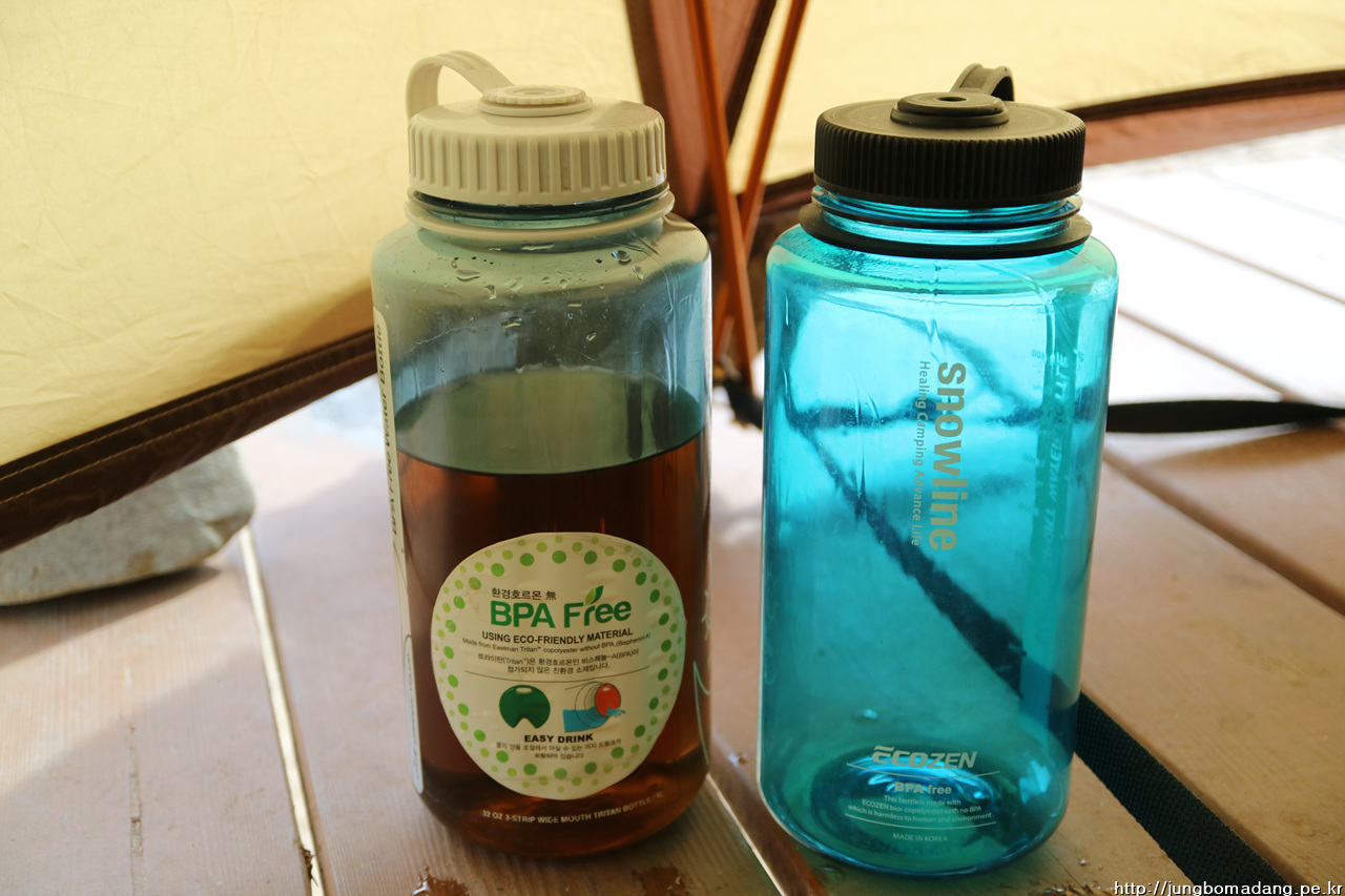 요건 깜짝 게스트로 제가 챙겨온 제가 직접 담근 3개월 된 야관문주(25도짜리로 담금)를 100ml만 먹고 남은거 한분에게 나눔해드리는 모습이구요. 우측 스노우라인(에코젠 재질) 물병이 제것입니다.