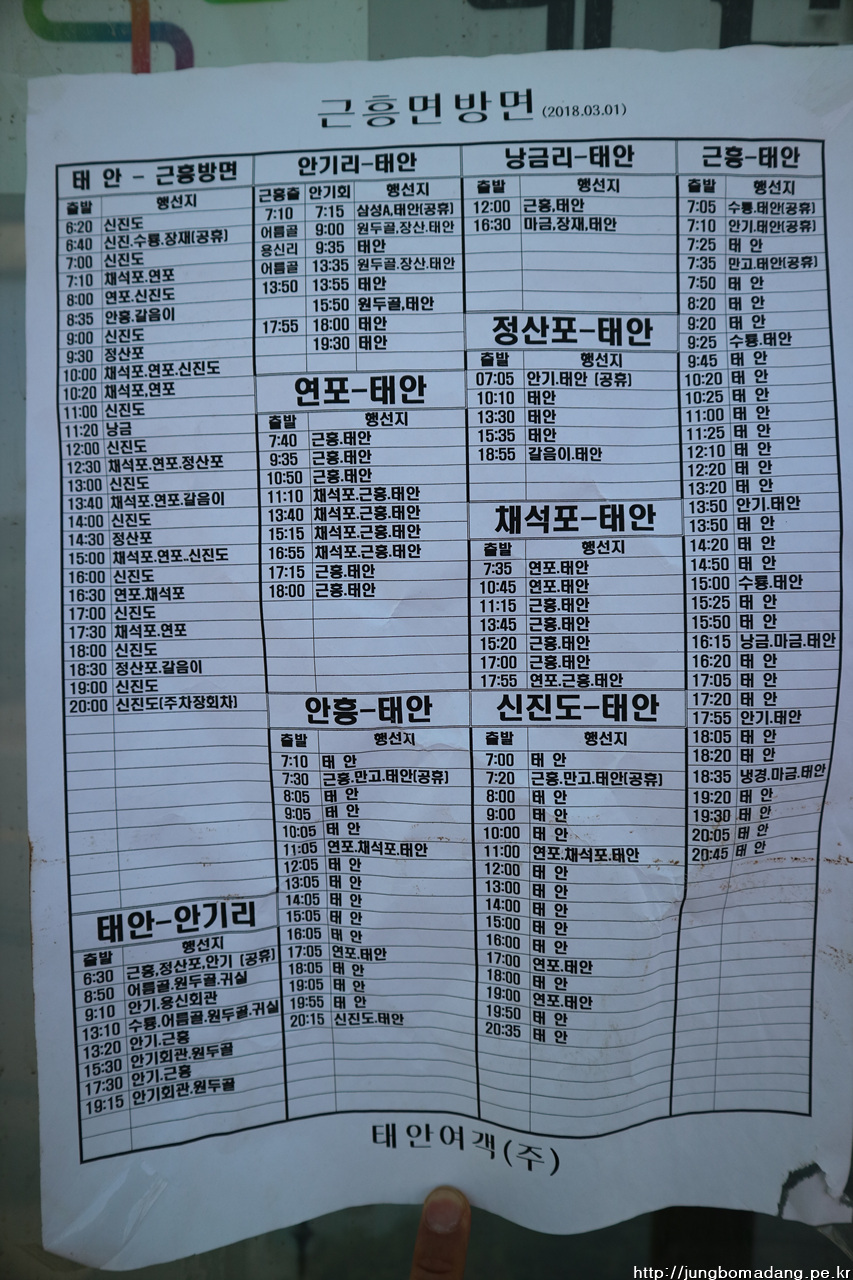신진도로 가는 군내버스 시간표를 보니 밥먹고 와서 대략 16:10이나 16:40 버스를 이용하면 될 듯 하네요. 태안여객 홈페이지에서 본 시간표랑 똑같습니다.