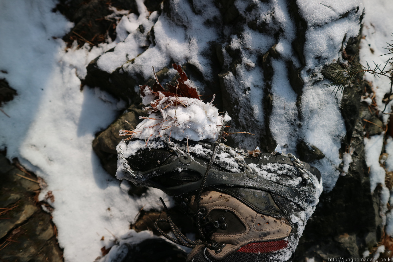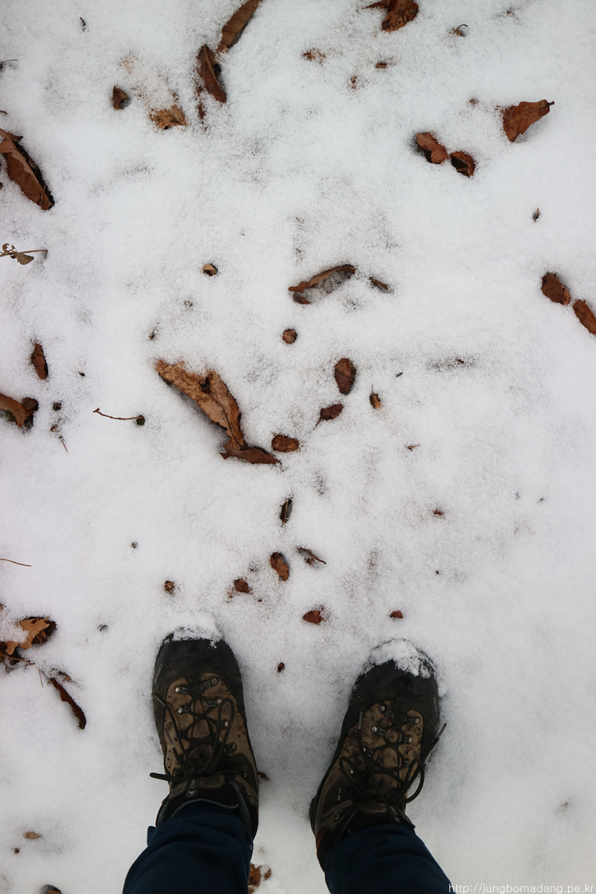 헐~ 낙엽과 눈이 뭉쳐서 아이젠에 들러붙는 이른바 스노우볼 현상 떄문에 두번이나 엉덩방아 찧었네요 ㅠㅠ