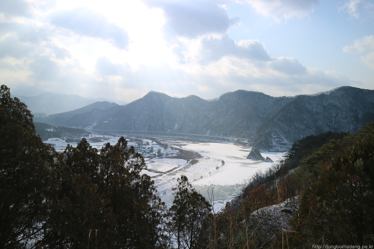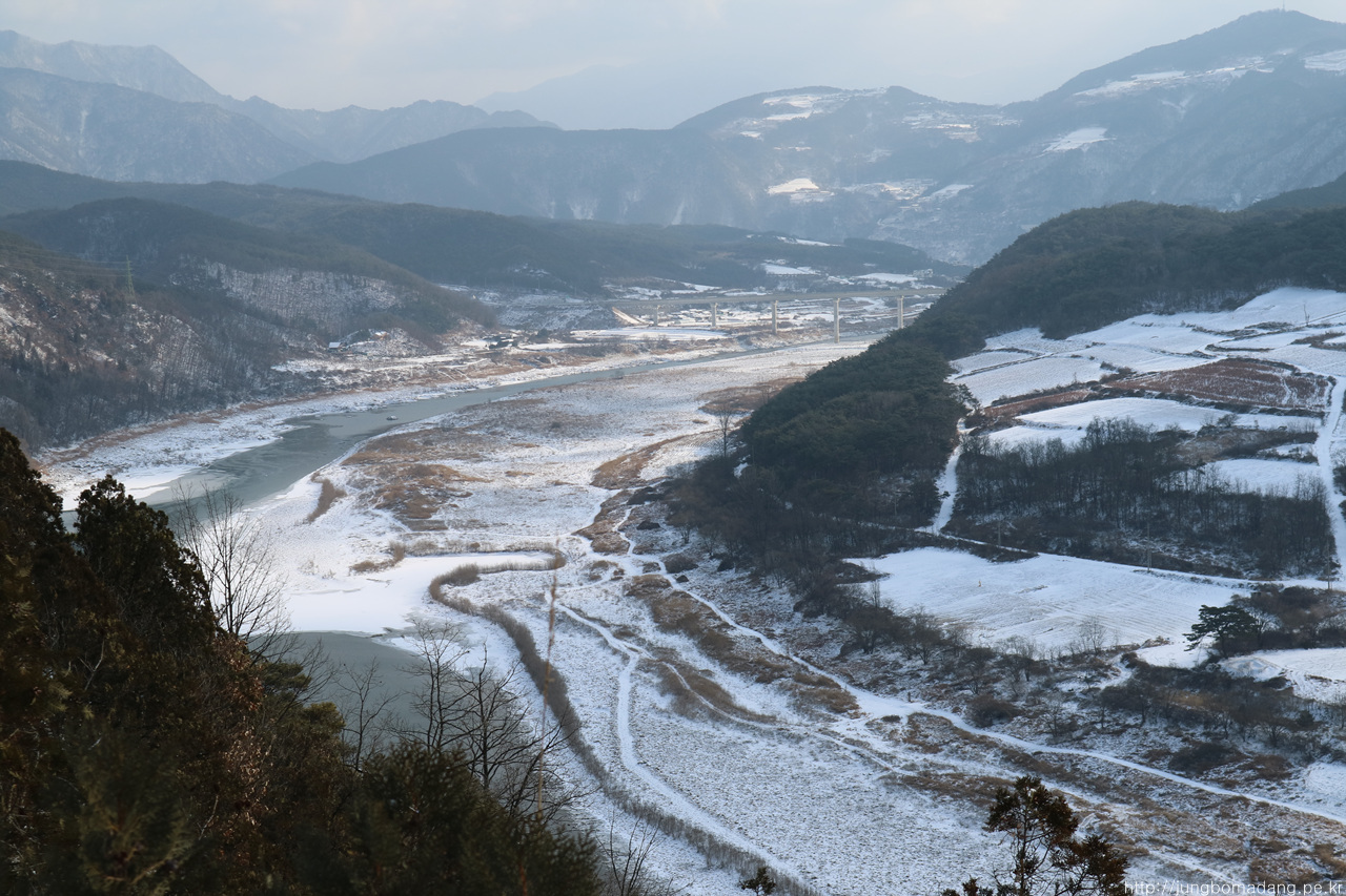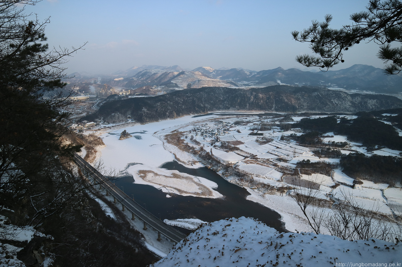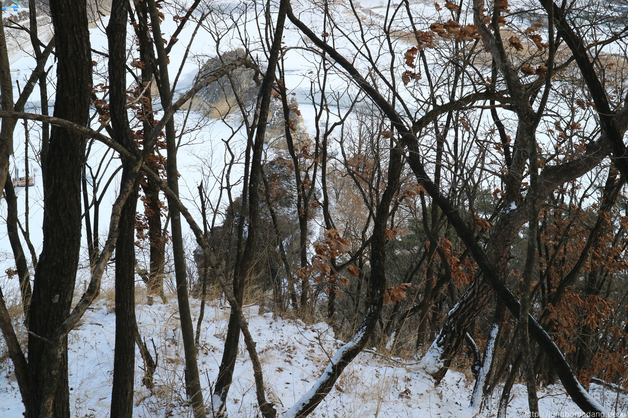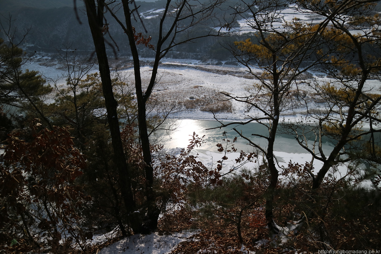 저 앞에는 앞으로 가야될 도담삼봉부터 시작되는 느림보 강물길이 보이구요. 지금 지나는 거친 등산로보다는 매우 착해 보이네요.