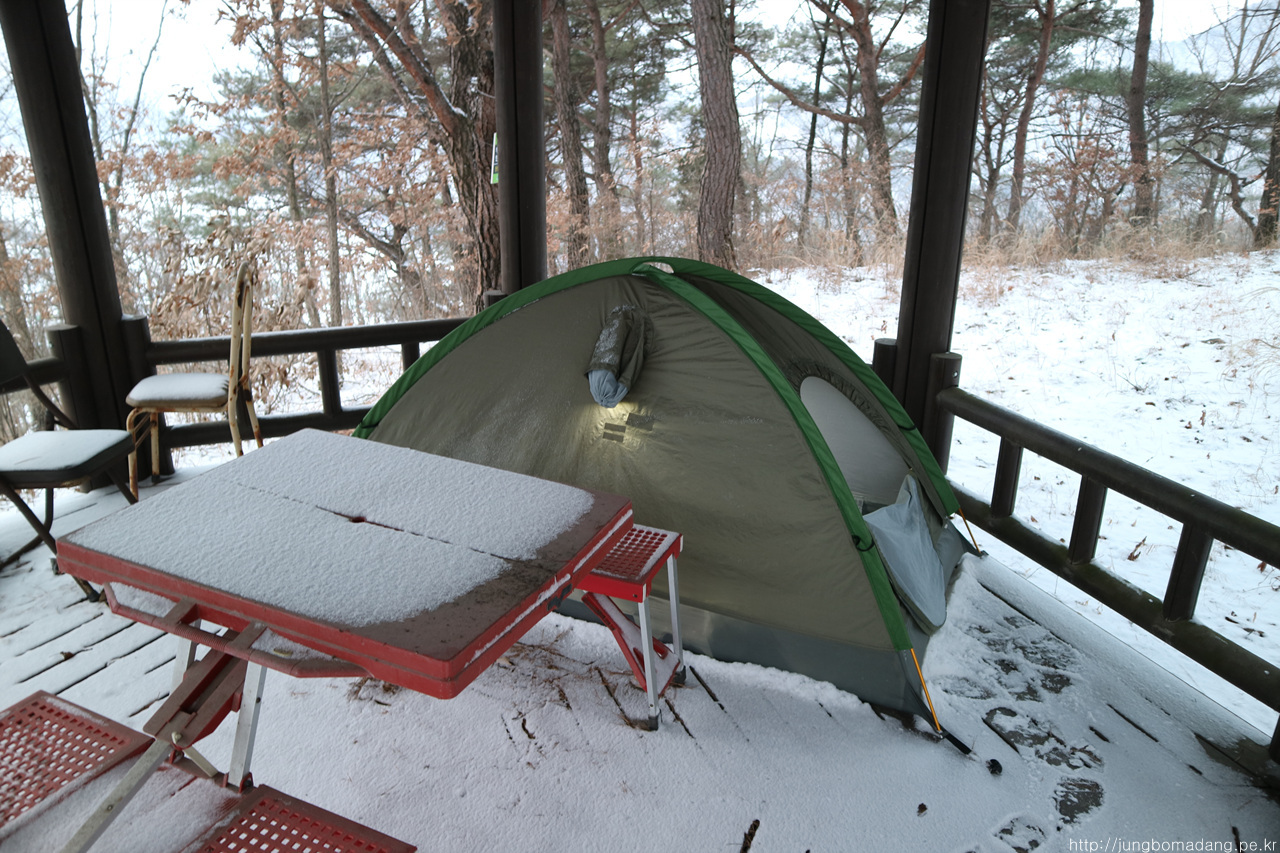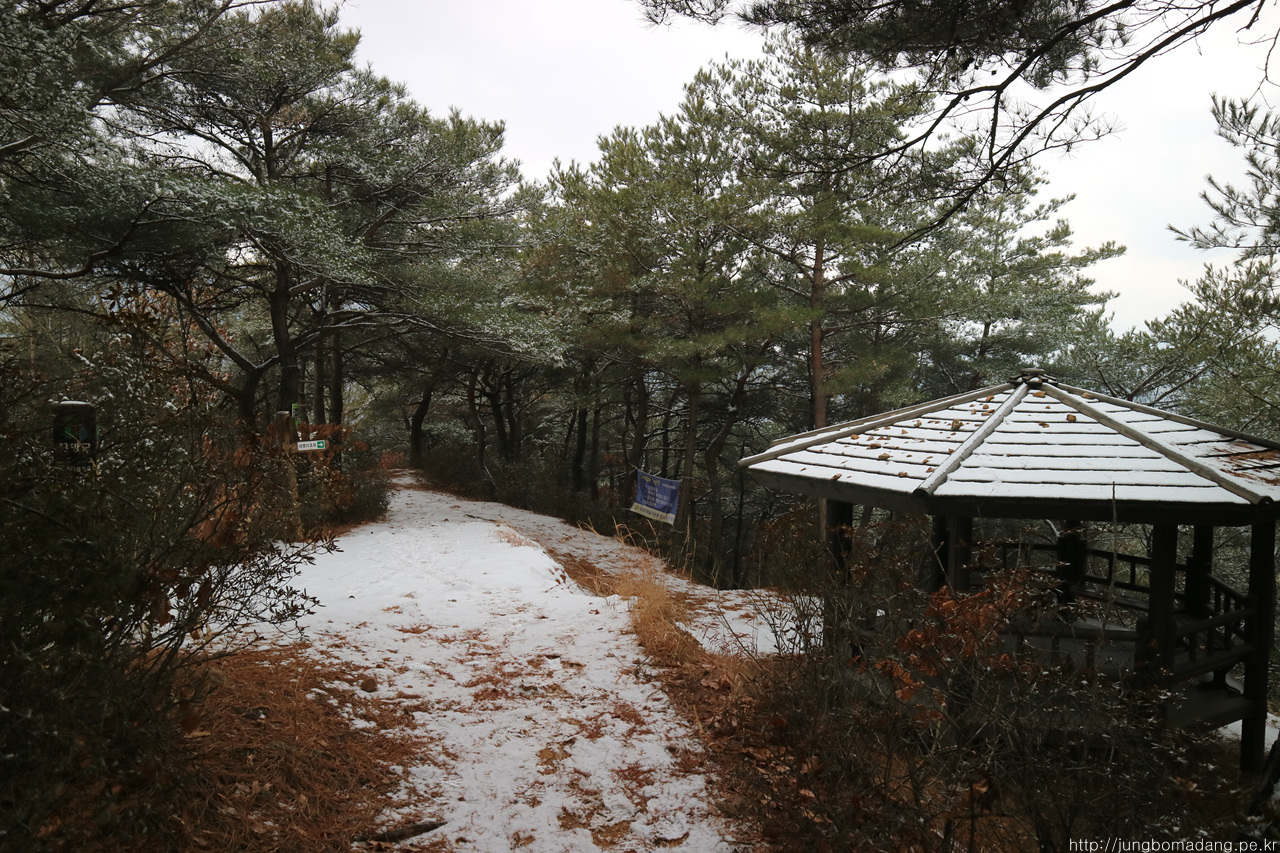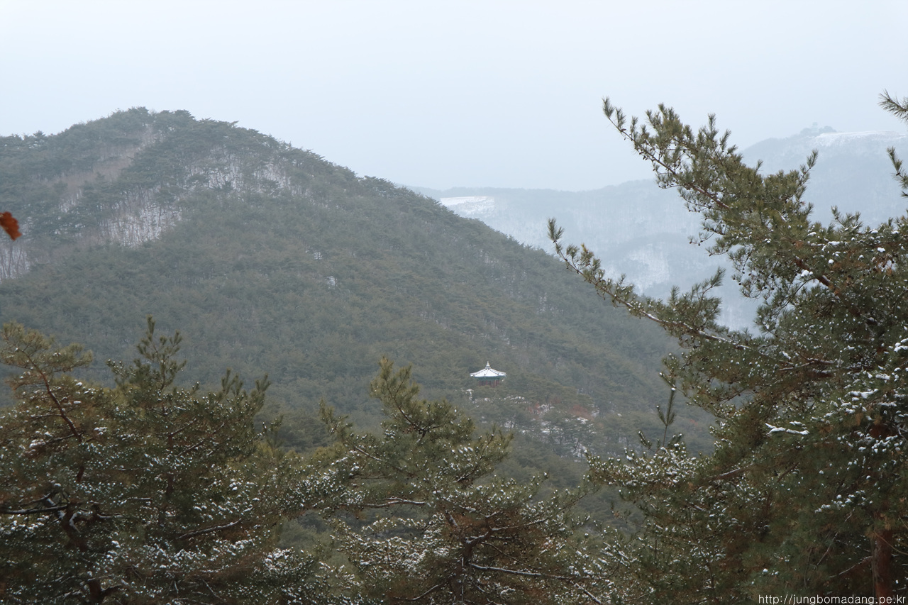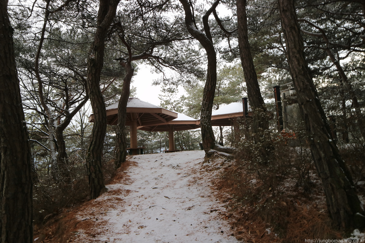 알고보니 새벽에 눈이 와서 정자 안에까지 온통 눈밭!