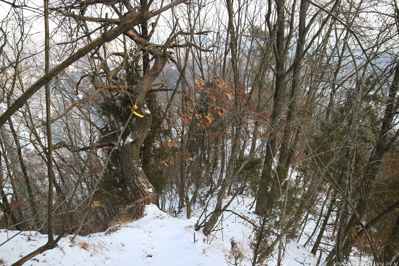 경사도 급하고 등산으로 거의 보이지 않아 요래 리본을 찾으면서 기존 산객들이 지나갔던 희미한 흔적을 찾아 갈지자 방향으로 어느정도 나무에 의지해서 내려가야 합니다.