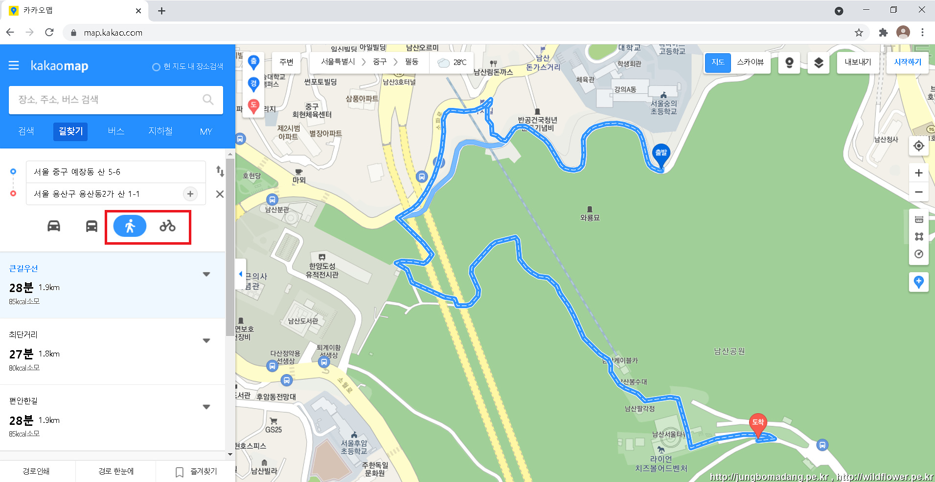 경로 표시가 되면서 좌측 메뉴가 [길찾기] 모드로 변경되는 데, 도보 또는 자전거로 선택 하시고,