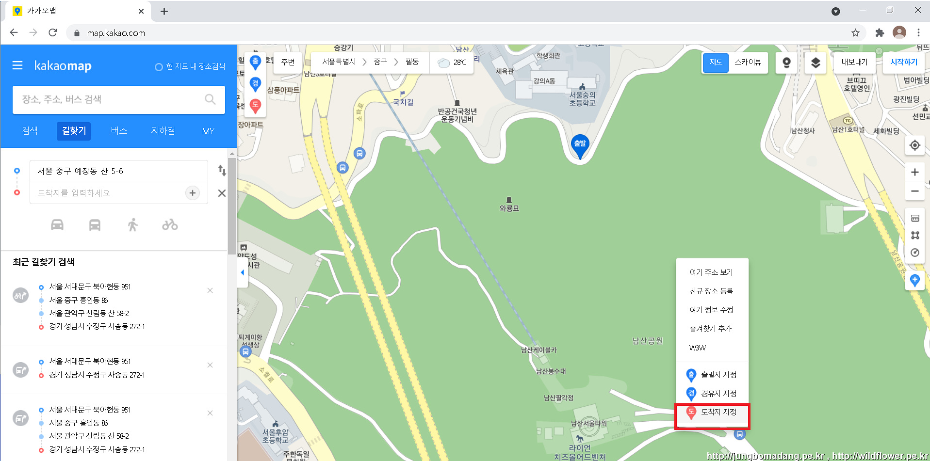 크롬에서 map.kakao.com 카카오맵을 접속 후 출발지 지정하시고,