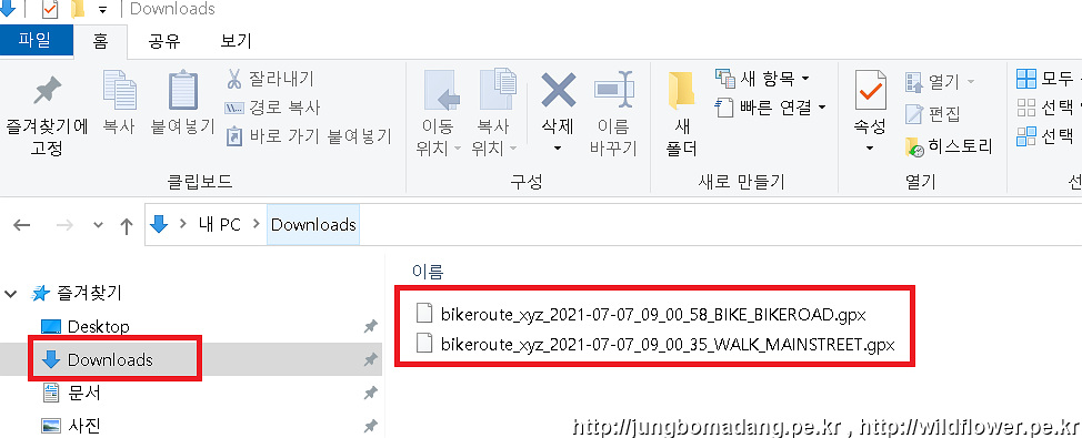 Windows 탐색기의 Download에 보시면 저장된 트랙 파일(gpx)을 확인하실 수 있는 데, 도보로 선택한 경우는 중간에 WALK라고 이름이 붙고, 자전거로 선택하신 경우 중간에 BIKE라고 이름이 붙습니다.