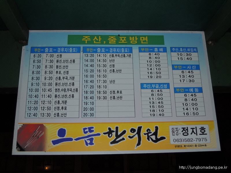 사자동은 하루 몇대 운행하지 않아요. 요건 내소사에서 되돌아올때 경유하는 줄포쪽 시간표입니다.