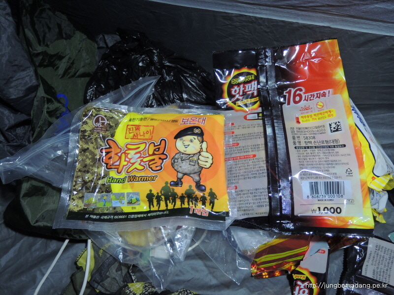 아! 여기서 충격적인건 어제 다이소에서 샀던 핫팩 2개중에 한개가 이렇게 터져버린 겁니다. 그덕에 내 자켓 주머니 안은 삐자져나온 내용물로 난장판... 다이소 화롯불 핫팩 절대! 사지 마세요. 데워지는 것도 늦고, 갑자기 뜨거워지고 이렇게 터지기까지.... 가격도 1000원이면 싸지도 않고!
