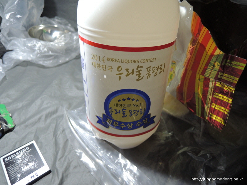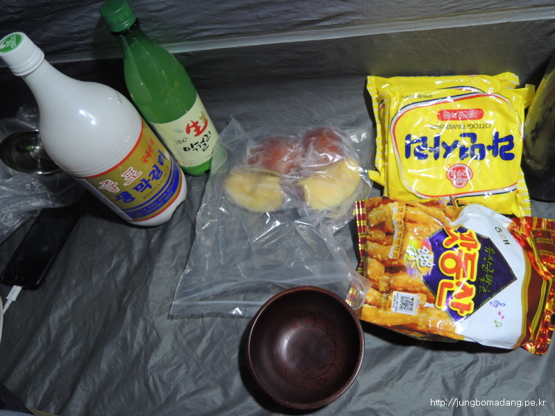 안주가 점점 부실해지네요. ㅋㅋㅋ 근데 그만큼 배낭 무게는 가벼워진다는 것! 배부르니 막걸리를 메인으로 맛동산을 오픈합니다.