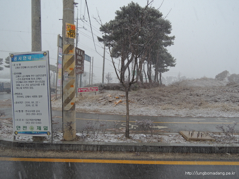 17:00 부안터미널에 도착했는 데 계속 눈이 계속 내립니다. 그래서 배낭 커버 씌우고, 우산도 펼칩니다. 근데 청바지는 어쩔 ㅋㅋㅋ. 우쩄든 하나로마트를 가기로 하고, 인근에서 눈에띄는 식당에 들어가 밥 먹고 하나로마트 털고 대충 정자가 있을거 같은 예상 박지로 이동하기로 합니다.