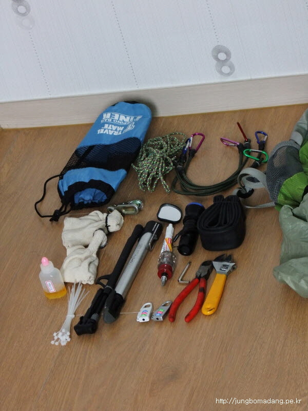 주 : 농협 텐트(후라이,폴대,T팩3개), 침낭라이너 500g, 비상보온포 1개 50g, 코베아 에어목배게 , 접이식 1인용 발포매트, 자작 랜턴(충전기 포함-블박 겸용).