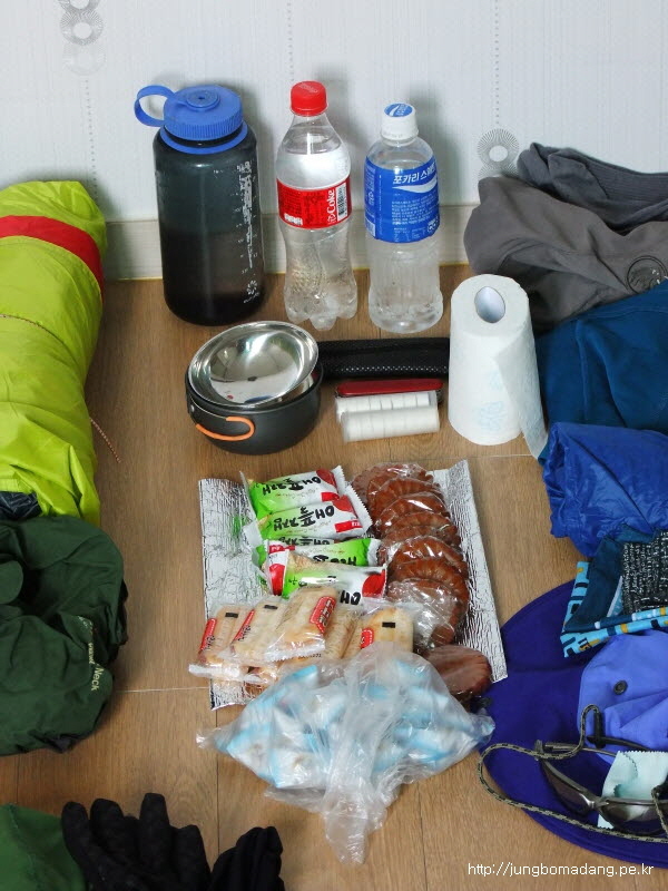 식... 먹거리죠. 뭔 과자쪼가리에 사탕에 약과.. 식수는 더우니까 2L 정도 챙겼네요. 중간에 보충할꺼니까 일단 이정도로! - 무게 3.29kg