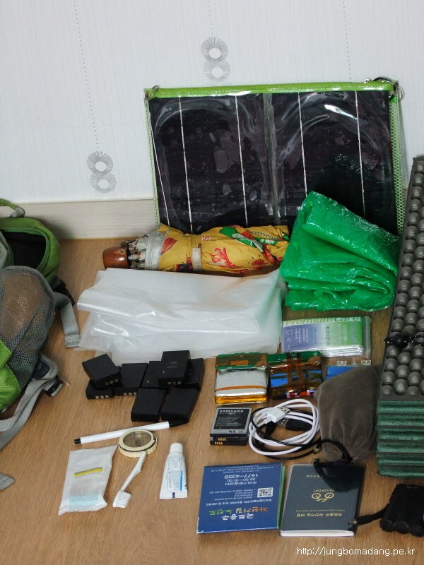 기타... 충전기... 우비, 우산 등등.. 눈에 띄는건 역시 솔라패널! ㅋㅋㅋ 스맛폰을 굶기지 않기 위한 처절한 사투가 엿보이네요. - 무게 2.2kg