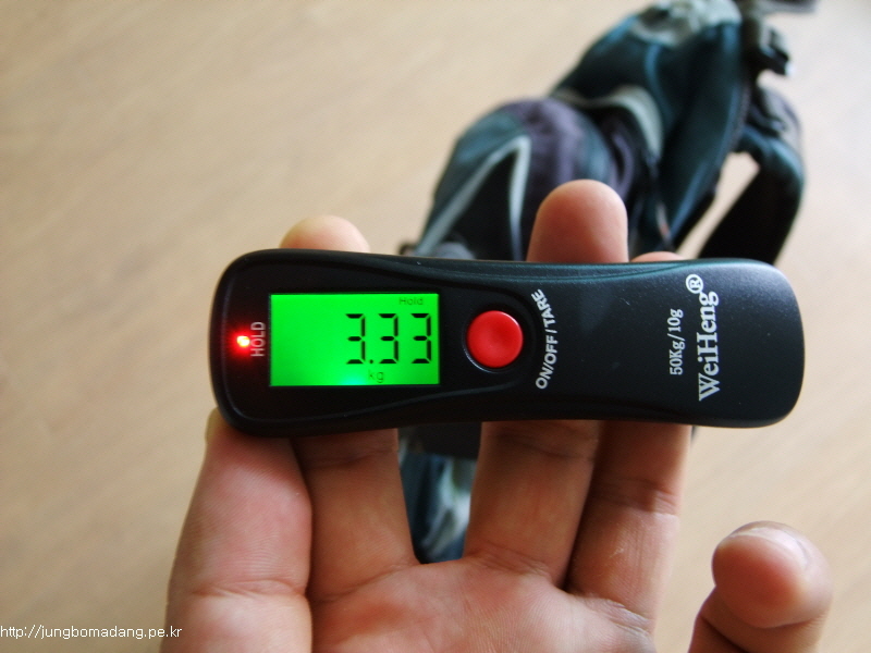 테스트로 제 자장구용 가방을 달아봅니다. 무게 달때 저울 아래 벨트를 고리에 감아서 측정하면 됩니다. 그리고 몇초 기다리시면 HOLD에 빨간 불이 들어오는 데, 이때 무게가 고정되서 표시되므로 제품을 내려놓아도 됩니다.