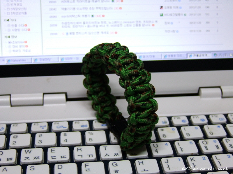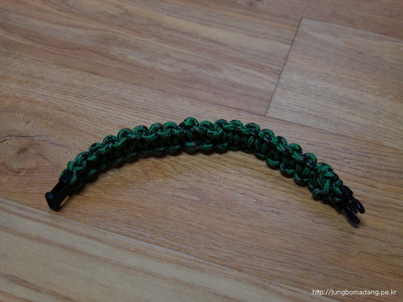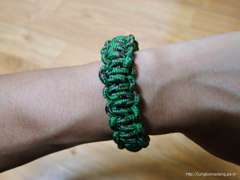 자~ 완성 되었습니다. 거의 끝부분까지 체결이 되었다면, 한번 팔목에 감아 보시고 만일 작거나 크다면 위의 줄을 풀러서 위의 1.~6. 방법을 반복한 뒤, 정확히 길이가 맞으면 마지막 튀어나온 줄은 적당히 자른뒤 라이터로 지져서 마무리해줍니다.