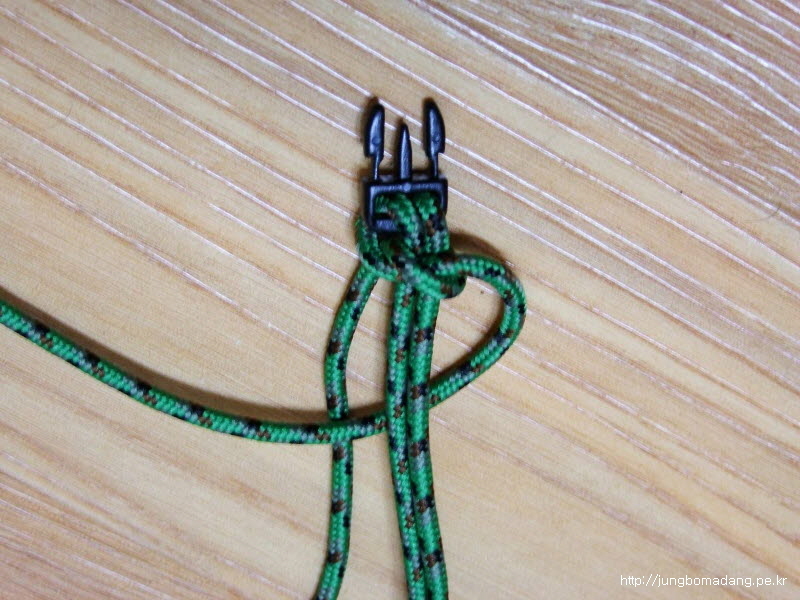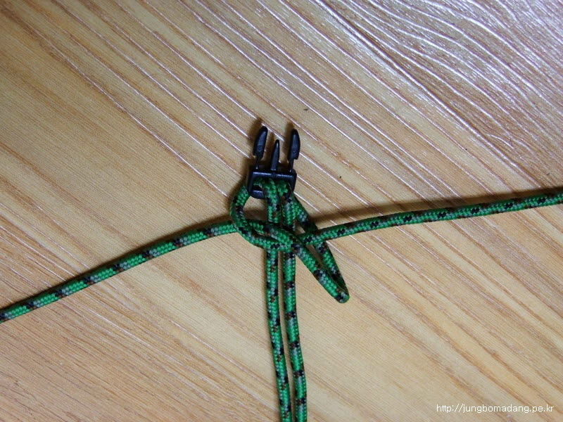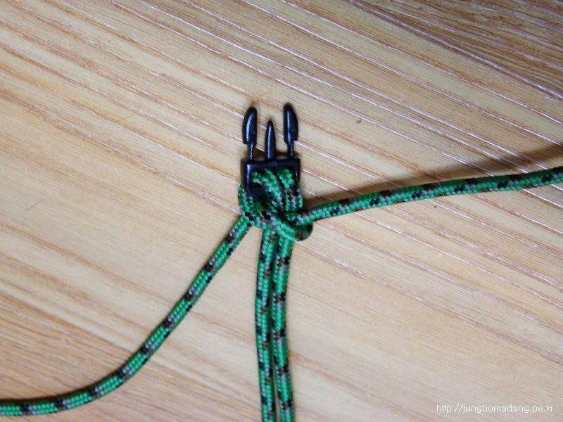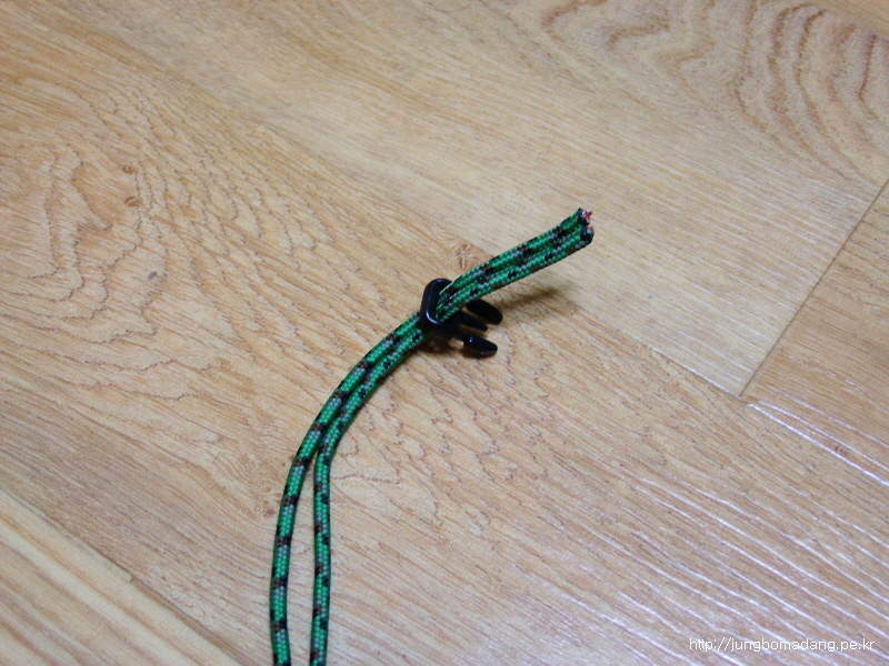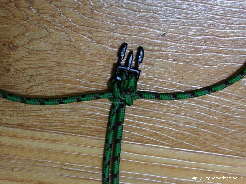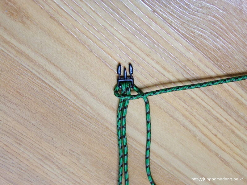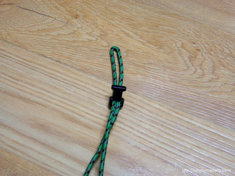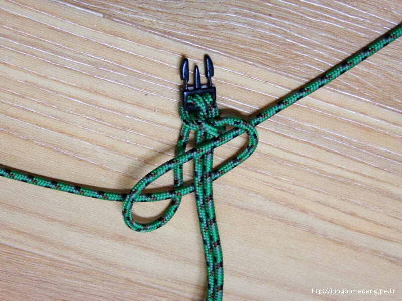 우선 낙하산 줄을 반을 접어서 접힌 부분 끝을 아래와 같이 버클 한쪽에 끼웁니다.