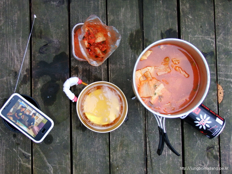 15:44 점심인지 저녁인지 모를 정체불명의 식사입니다. 여기엔 남은 음식인 라면 1개, 밥 2덩어리, 김치 싹 털어서 식사 겸 안주겸 먹습니다. 몸도 개운하고, 좀 욱신거리긴하지만, 이순간 만큼은 대통령도 안부럽네요!!