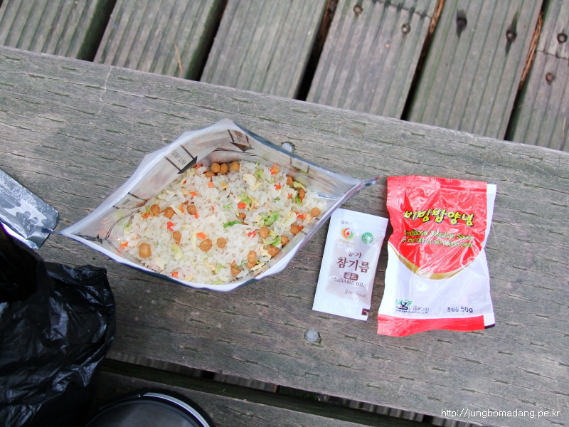 13:07 삼각봉대피소 도착! 여기서 비로소 미루어둔 점심으로 전투식량 하나를 먹습니다. 남은 물로 코피도 살짝 말아 먹구요.