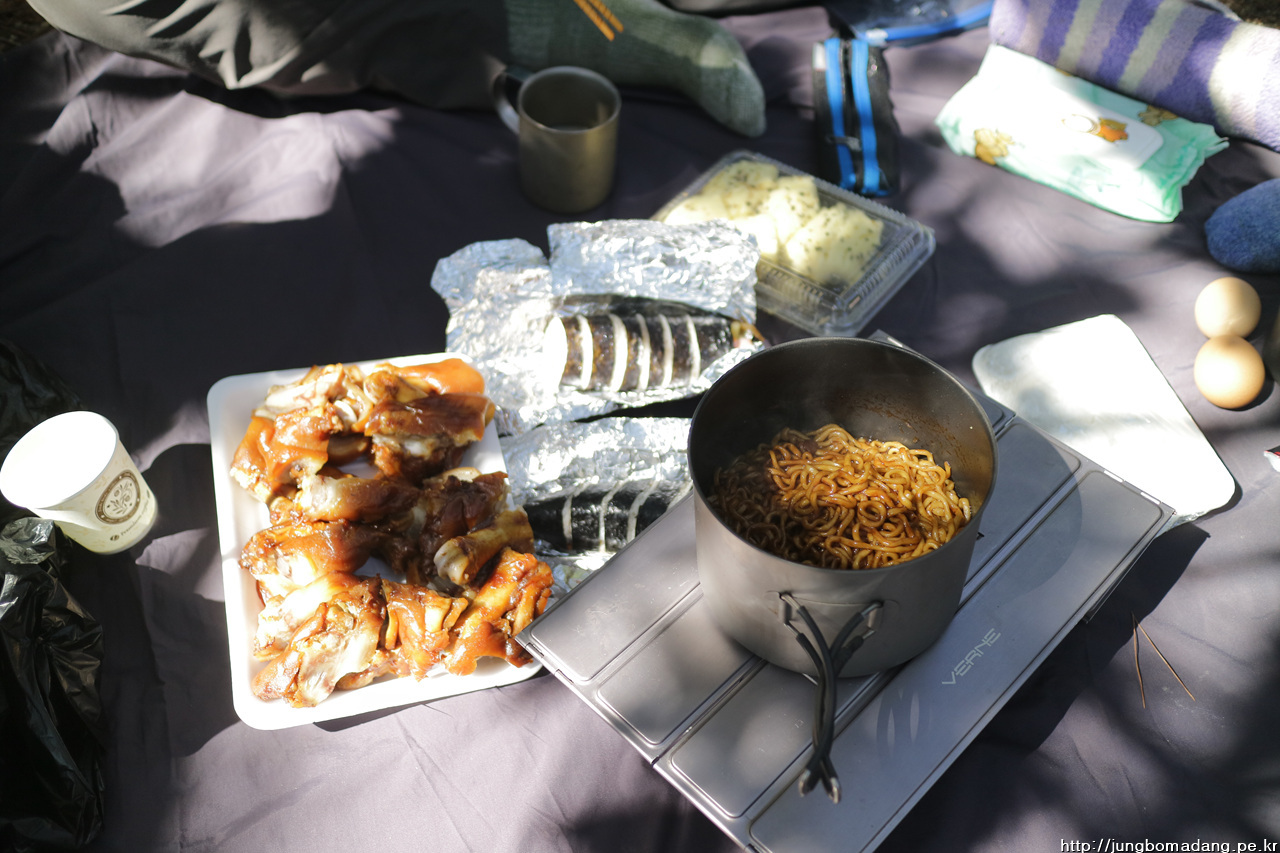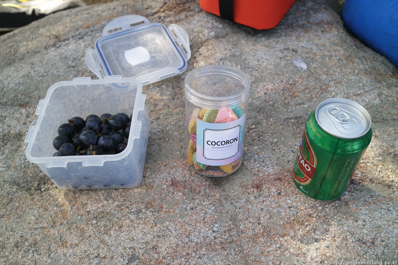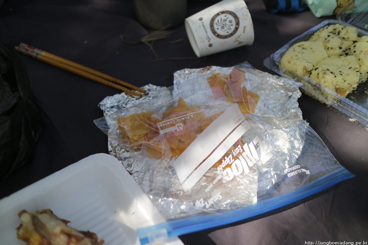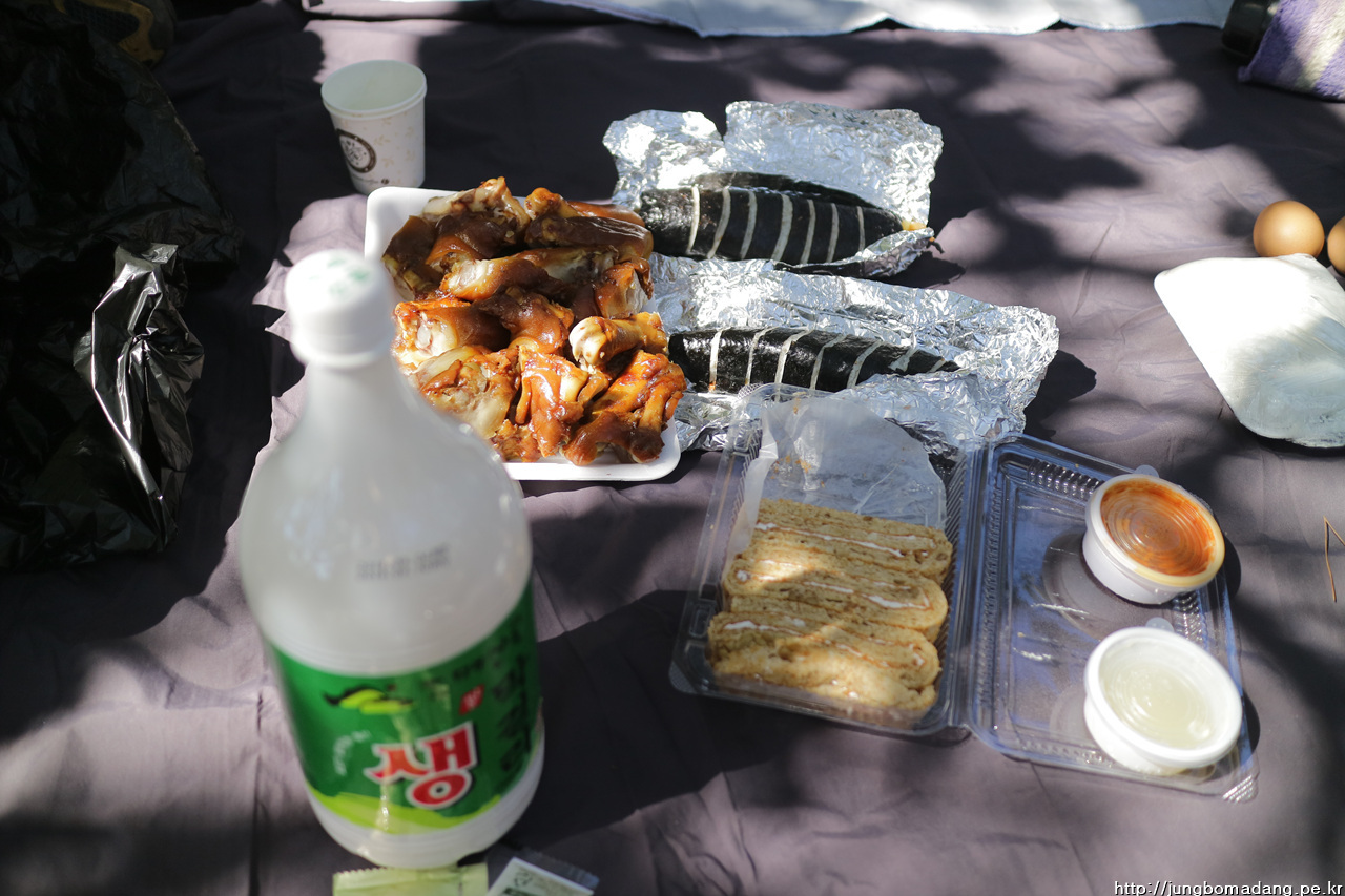 13;27 늦은 점심을 가져 봅니다. 제가 챙겨간 지리산에서 업어온 막걸리와 다른 분이 챙겨오신 음식(족발, 김밥, 수제빵, 말린과일)과 함께하니 푸짐합니다.