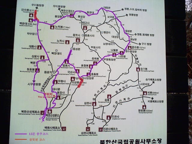 이제 등산한지 겨우 3개월 밖에 안되었는 데, 조촐하게 종주를 하다보니, 나름대로 뿌듯하기도 하고, 힘들기도 하고, 그리고 보람이 참 큽니다. 중간 중간에 체력를 언급했는데, 오늘 산행에서 결정적인 실수를 한가지 했습니다. 기존에 혼자 3~4시간 산행할때엔 별도의 음식(점심, 간식)을 준비하지 않고 먹을 물만 가지고, 산행을 진행했었는 데, 별 문제가 없었습니다. 하지만, 이번엔 좀 달랐습니다. 산행시간을 8시간정도 예상을 했으며, 김밥이며, 간식을 준비해 가려고 했지만, 이른 아침이라 귀찮기도 하고, 돈도 아깝고 해서, 그냥 진행했는 데, 산행 후반부로 갈수록 체력이 급격하게 떨어지더군요. 마지막 원효봉(북문)으로 오르는 겨우 500M밖에 안되는 거리도, 나에게는 시련으로 다가오더군요. 그 덕에 집에 돌아온 다음 녹초가 되었답니다. -.-" 앞으로는 귀찮더라도 챙길건 꼭! 챙겨야 겠습니다.
