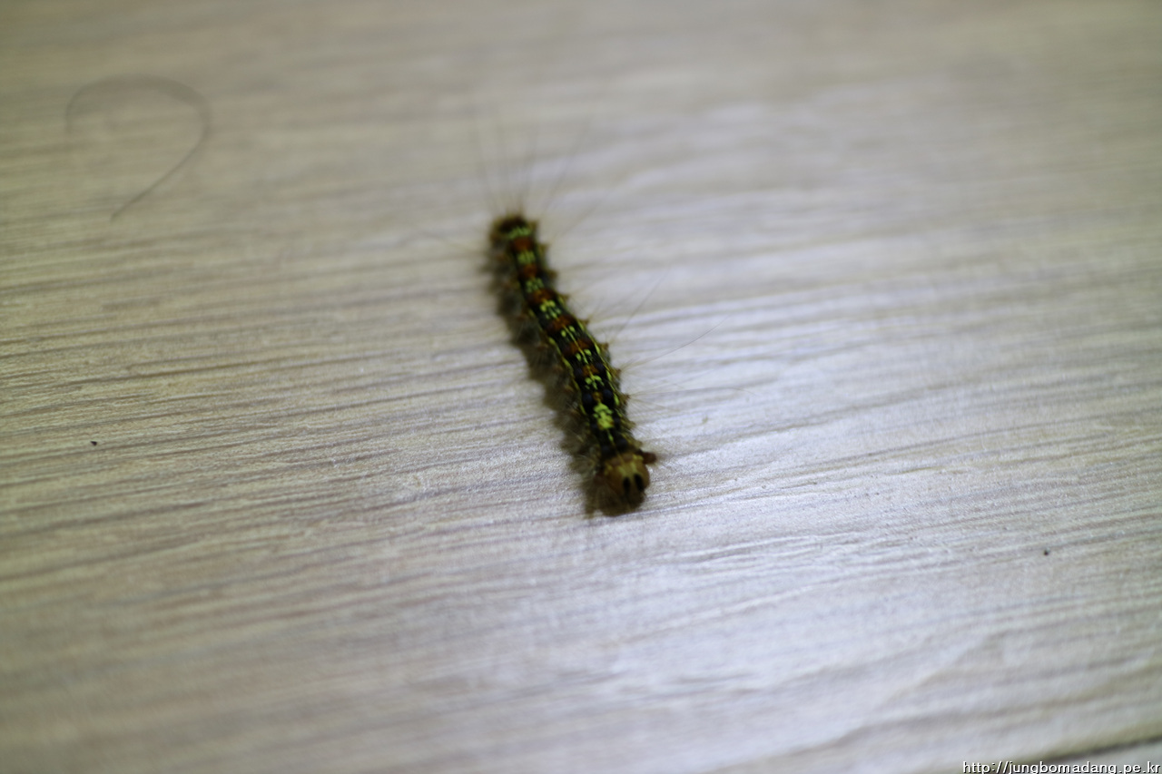 꺄아악~~ 방에서 유유자적 기어당기는 매미나방애벌레, 아마 가방에 무임승차해서 온걸로 추정합니다. 죽일 수는 없으니 잘 옮겨서 창밖으로 퇴출시킵니다. ㅋㅋ