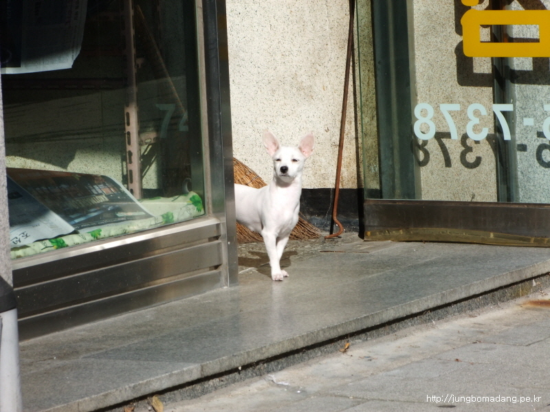 버스 정류장에서 버슬 기다리다 근엄하게 자세 잡고 있는 견공을 한장 담아 봅니다.