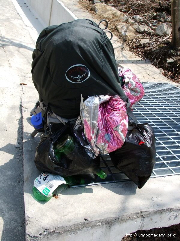 13:08 짬짬히 수집한 쓰레기가 한가득이네요... 비닐봉지를 작을 걸 가져왔더니 후회 막급입니다. 오늘 산행을 하러 온건지, 사진을 찍으러 온건지, 쓰레기를 주우러 온건지 헤깔립니다. ㅎㅎㅎ 담엔 봉다리를 큰걸 가져와야 겠습니다...!
