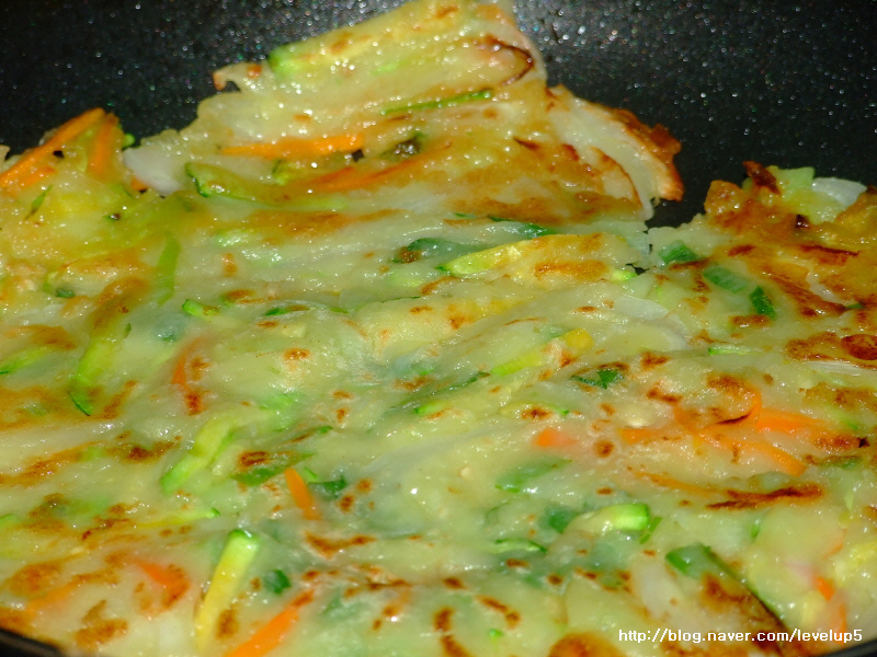 호박,당근,파,양파를 잘개썰고 부침가루와 물 적당히 배합해서 소금 조금 치고 그렇게 만들어본 전... 음...